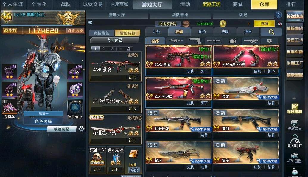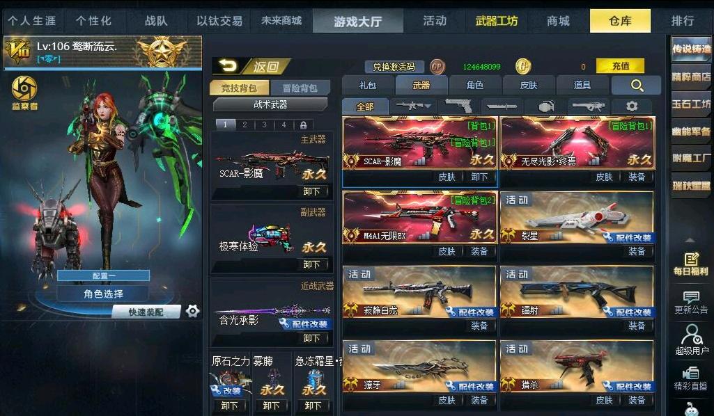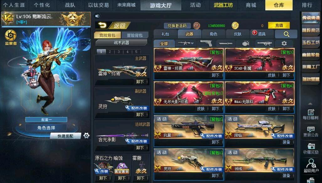 联通4区!V10影魔+终焉!原石+翎羽+含光+镭射等37把配件武器满配!潘多拉皮肤+EX+众多武器皮肤!128万战力!天界使者满配、彗星满配、瞬影满配、含光承影满配、翎羽满配、原石之怒满配、原石之力满配、幻锋满配、戏法幻刃满配、虚空连弩满配、守卫者满配、光棱满配、寂静白龙满配、虚空折越满配、虚空漫游满配、镭射满配、霜雪满配、火山满配、藏锋满配,虚空链接满配,幻影侍卫满配,无限火力满配,糖果工厂满配,突刺先锋满配,狼牙VAL满配,定风波满配,弦月飞刃满配,镇压者满配,耀光满配,腐化劣魔满配,猎杀满配,獠牙满配,裂星满配、狂暴之握满配、变形怪客满配、自律守卫满配等等! 风驰套装!魔方贰+狂化激素贰!极寒体验(皮肤涂鸦)霓虹之翼l3!机械之翼!具体等你上号查看!
