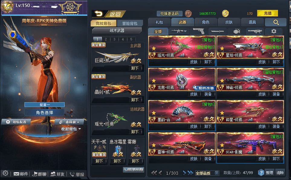 传说武器:瑶光·终焉◆星魄·终焉◆ RPK主宰◆龙息·终焉◆神谕·终焉◆AK47主宰◆墨韵·合◆碎星·终焉◆雷神·终焉◆SCAR-影魔◆无尽光影·终焉◆M4A1无限EX◆屠魔◆AK47天神◆