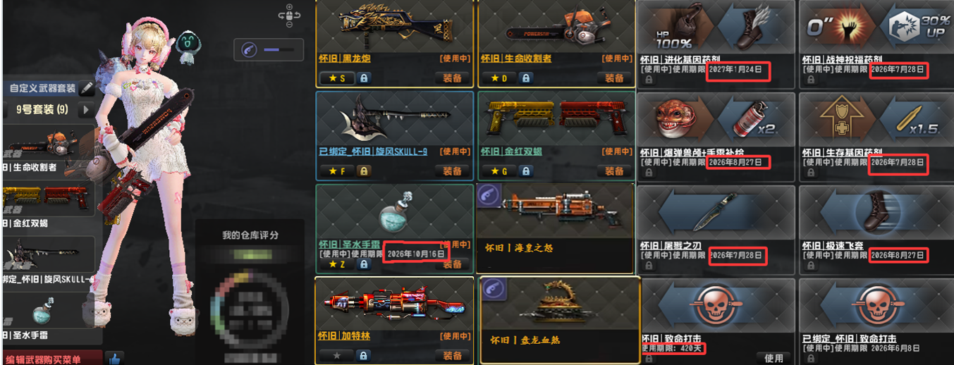3.除紫钻武器外,有紫钻之外的:更新:天巡1,2,3和5,怀旧黑龙炮,斧头,金红双蝎和加特林!已去黑雾!6到21赛季悬赏,配件武器大部分6阶,其他最少5阶,强化武器全满!
