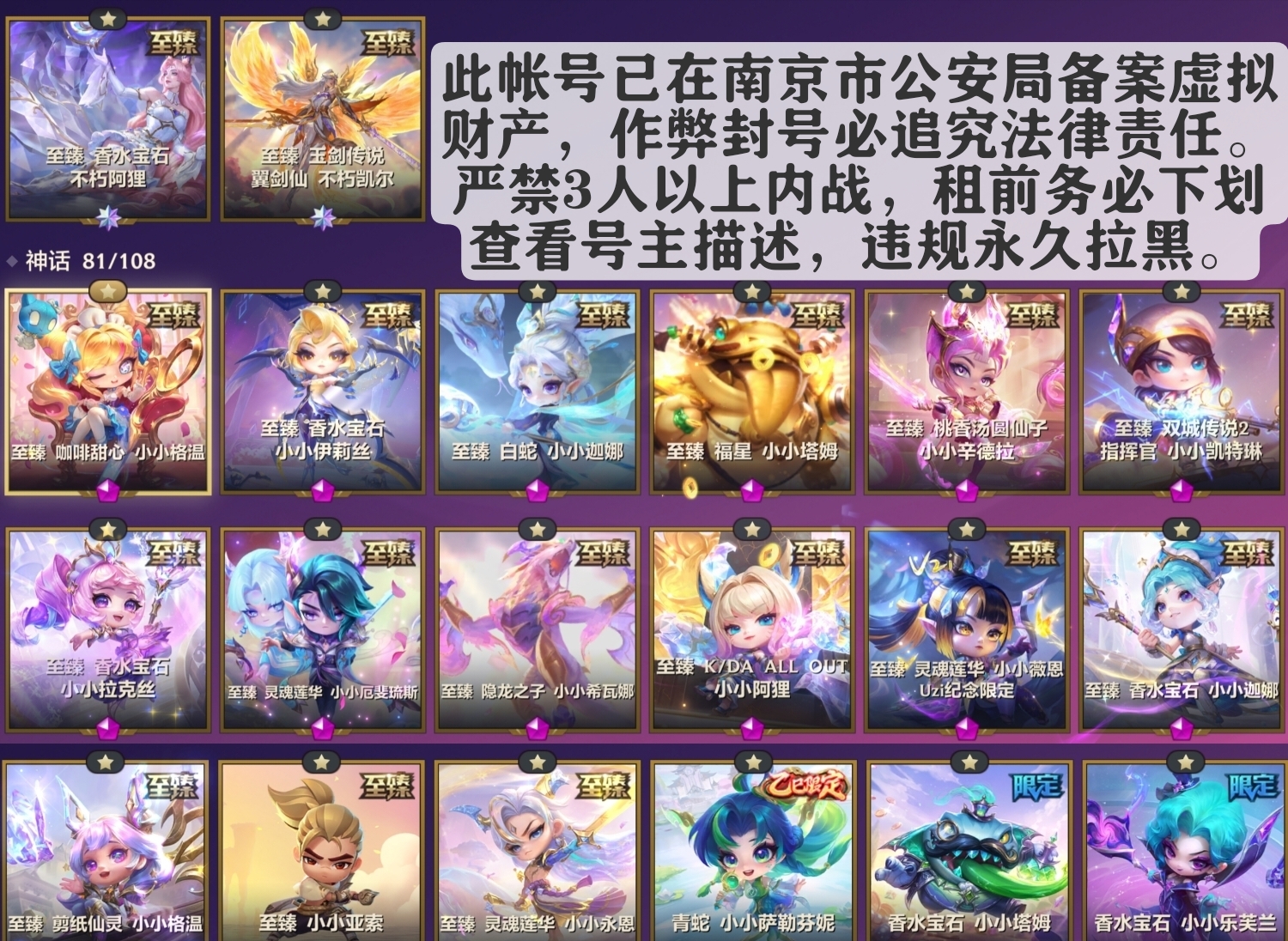 超高性价比账号,可以先收藏以防迷路。随意撤单者、顶号、查完道具流水时间点后 发现私自动用魔尘 晶能石 召唤积分 点券等道具者一律永久拉黑!!!你将永远无法租玩本店所有游戏账号。租后可能会有账号残留,有人顶号请及时私信我,我会查ip然后永久拉黑顶号租客。