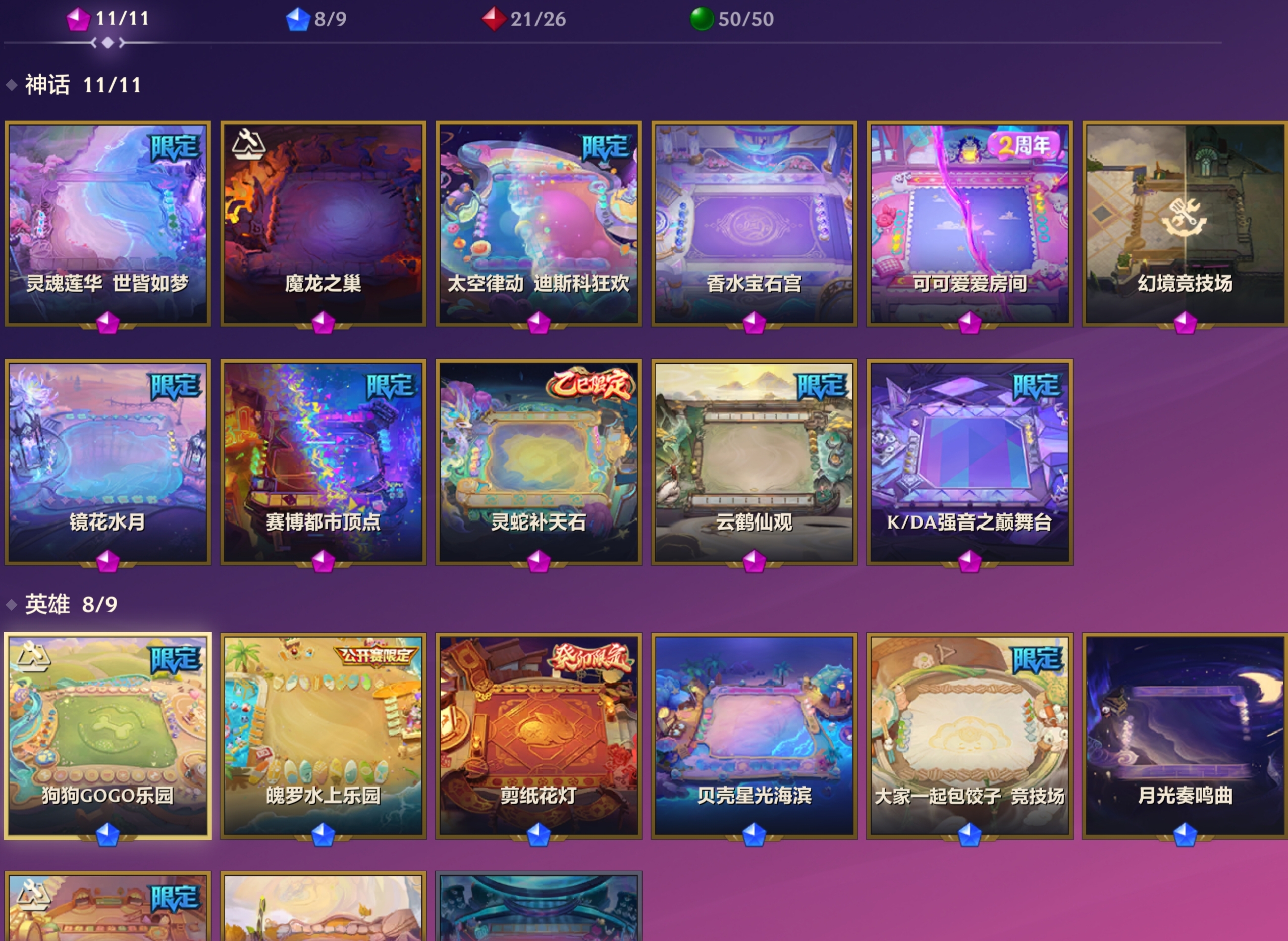 竞技场:镜花水月/云鹤仙观/太空律动迪斯科狂欢/灵魂莲华世皆如梦/赛博都市顶点/魔龙之巢/可可爱爱房间/香水宝石宫/灵蛇补天石/狗狗GOGO乐园全收集/喵喵妙妙屋全收集/月光奏鸣曲/魄罗水上乐园/贝壳星光海滨/大家一起包饺子/剪纸花灯/云海九天/雨过城楼/金克丝的卧室/元宵饭店/魔法瀑布/魄罗的滑雪乐园/竹林禅院/演武场/魄罗糖果岛等等