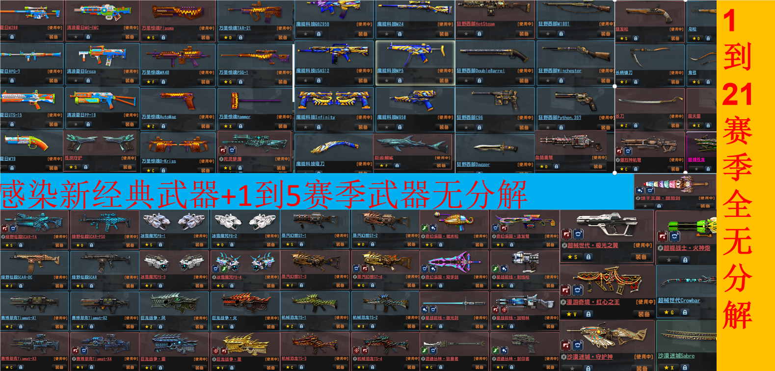 3.更新:怀旧三件套金红双蝎黑龙炮斧头!已去黑雾!赛季从1到21赛季都有且无分解(缺20);强化武器全满,配件武器主要6阶,其他最少5阶!