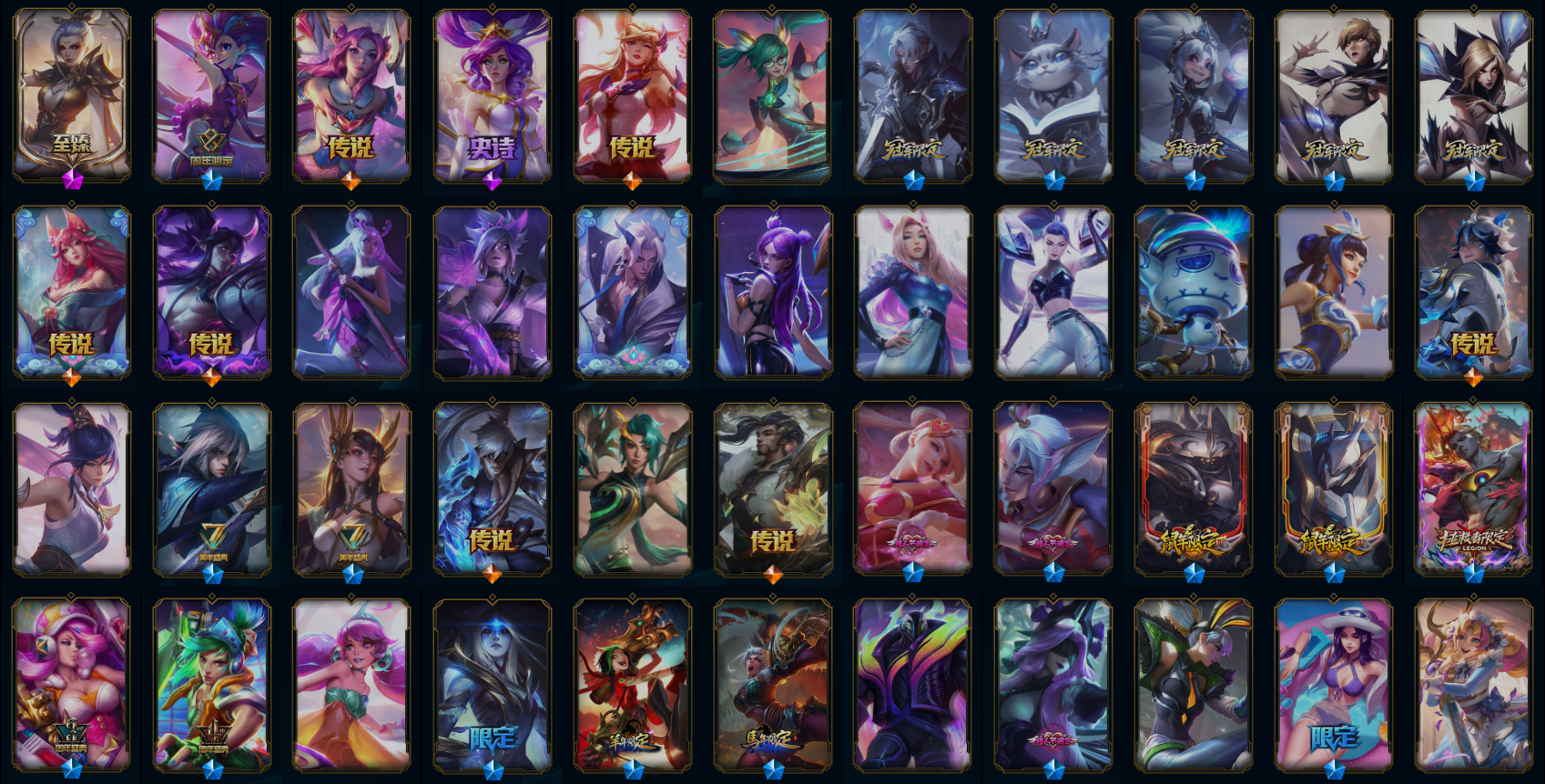 【传说皮肤】合金巨兽努努和威朗普 暗星锤石 魔女伊芙琳 炼狱魔犬内瑟斯 女皇艾希 苍穹之光韦鲁斯 最终BOSS维迦 上古战魂魔腾 星之守护者金克丝 未来战士凯特琳 绅士科加斯 苹果机器人布里茨 屠龙勇士潘森 霸天异形卡兹克 黎明使者永恩 至尊魔女莫甘娜 符文战熊沃利贝尔 焰尾妖狐阿狸 灵魂莲华阿狸 星之守护者霞 电玩女神娑娜 神龙尊者昼日真龙亚索 天煞劫 地狱之门卫士加里奥 魔幻卡牌崔斯特 铁哥们儿奥拉夫 灵魂莲华锤石 恶魔男爵瑞兹 欧米伽小队幽灵特工 提莫约德尔人的一大步 金牌主播德莱文 邪鸦魅影乐芙兰 战地机甲厄加特 西部魔影卢锡安 源计划毁灭派克 奥德赛凯隐 宇航员诺提勒斯 暗星尊烬 战斗学院伊泽瑞尔 冰霜亚龙希瓦娜 冰霜之刃艾瑞莉娅 黯晶凤凰艾尼维亚 月蚀骑士蕾欧娜 血石领主弗拉基米尔 腥红之月鬼武姬阿卡丽 星之守护者拉克丝 黑夜使者亚索 真实伤害艾克 冰川巨兽墨菲特 女主播迦娜 第三类接触黑默丁格 女校长菲奥娜 星之守护者阿卡丽 钢铁之翼凯尔 黎明使者锐雯 双重冰晶艾尼维亚 鬼魂新娘莫甘娜 战地巨兽科加斯 女警狙击凯特琳 黯黑魔龙希瓦娜 丧尸布兰德 大天使长米迦勒凯尔 耀星女神拉克丝 源计划净化薇恩 神龙尊者圣龙李青 神王德莱厄斯 枯萎之壤泽拉斯 灌篮高手德莱厄斯 陆地王者4WD布里茨 烈焰雄心崔丝塔娜 星之守护者卡莎 律政大亨蒙多 影执事劫 星之守护者阿狸 战场女武神凯尔 青花瓷伊泽瑞尔 光明哨兵格雷福斯
