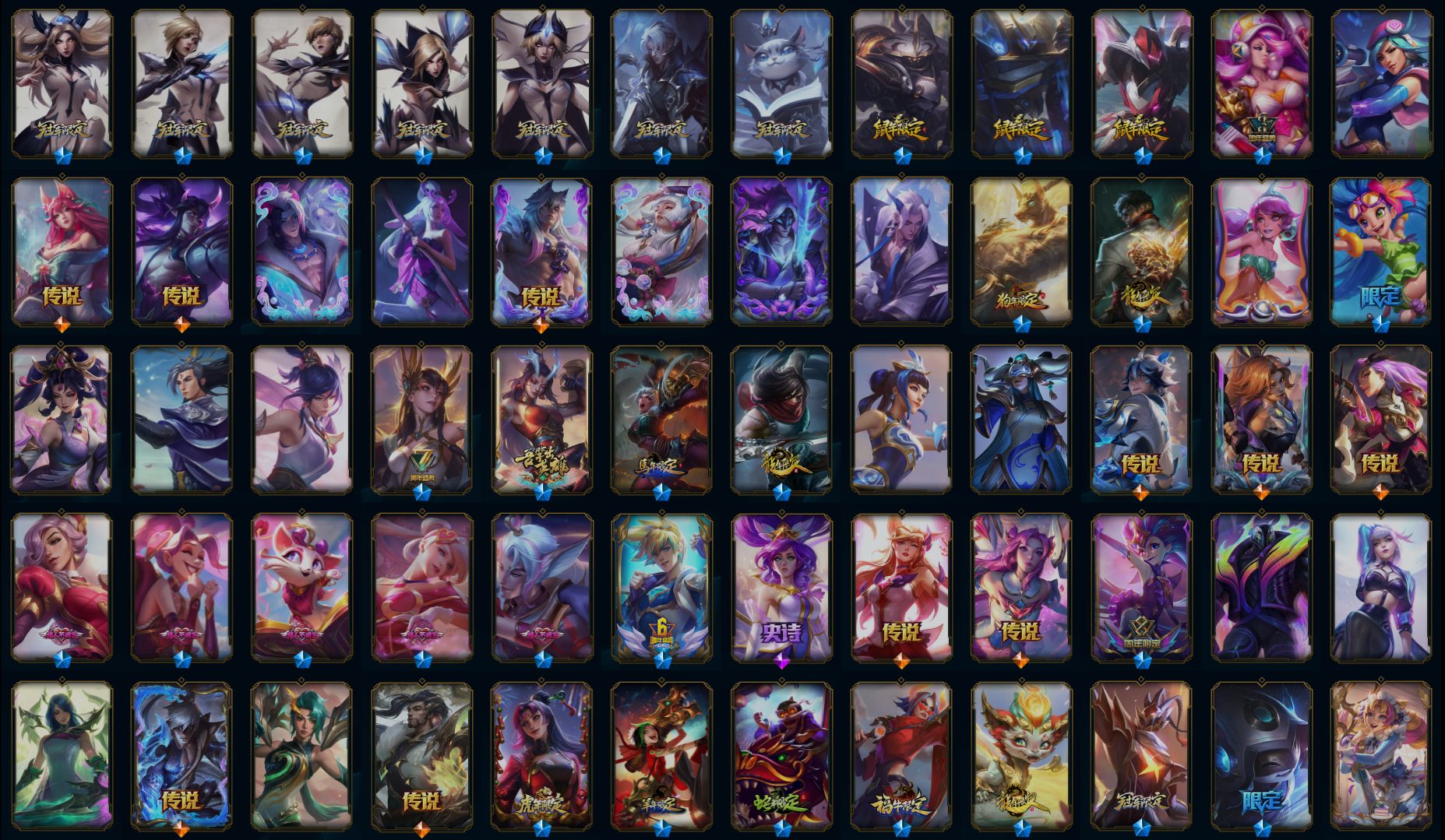 【传说皮肤】钢铁军团盖伦 神龙尊者昼日真龙亚索 太空律动律动队长提莫 冰霜之刃艾瑞莉娅 真实伤害艾克 魔女伊芙琳 恶魔男爵瑞兹 绝息圣堂锐雯 神王盖伦 战地机甲厄加特 青花瓷伊泽瑞尔 神龙尊者夜月幻龙亚索 源计划林易 屠龙勇士潘森 女帝卡特琳娜 日蚀骑士希维尔 灵能特工娑娜 黎明使者索拉卡 女警狙击凯特琳 日蚀骑士蕾欧娜 黑夜使者索拉卡 驯龙学者黑默丁格 灵魂莲华瑟提 耀星女神拉克丝 星之守护者卡莎 西部魔影大小姐蕾欧娜 战斗学院凯特琳 黎明使者永恩 幻灵战斗队长厄运小姐 奥德赛凯隐 源计划超体莫德凯撒 暗星女王拉克丝 星之守护者拉克丝 黎明使者锐雯 月蚀骑士蕾欧娜 死亡骑士盖伦 腥红之月鬼武姬阿卡丽 战斗学院伊泽瑞尔 血石领主弗拉基米尔 炼狱魔犬内瑟斯 第三类接触黑默丁格 地狱行者孙悟空 源计划净化薇恩 银河魔装机神兰博 神龙尊者圣龙李青 神拳李青 丧尸布兰德 上古战魂魔腾 源计划毁灭派克 冰川巨兽墨菲特 太空律动猫猫布里和里茨 未来战士凯特琳 苹果机器人布里茨 陆地王者4WD布里茨 最终BOSS维迦 星之守护者霞 红色男爵库奇 暗星锤石 魔幻卡牌崔斯特 灵魂莲华锤石 女主播迦娜 电玩女神娑娜 律政大亨蒙多 双重冰晶艾尼维亚 黯晶凤凰艾尼维亚 地狱之门卫士加里奥 绅士科加斯 战地巨兽科加斯 鬼魂新娘莫甘娜 至尊魔女莫甘娜 西部魔影卢锡安 天煞劫 西部天使赛娜 西部天使艾希 源计划联合艾希 星之守护者金克丝 恶魔之刃泰达米尔 暗星尊烬 女皇艾希 铁哥们儿奥拉夫 合金巨兽努努和威朗普 烈焰雄心崔丝塔娜 驯龙炮手崔丝塔娜 欧米伽小队幽灵特工 约德尔国队长提莫 提莫约德尔人的一大步 黑夜使者亚索 霸天零式赛恩 神王德莱厄斯 灌篮高手德莱厄斯 金牌主播德莱文 霸天异形卡兹克 蔷薇绅士杰斯 泳池派对吉格斯 宇航员诺提勒斯 符文战熊沃利贝尔 苍穹之光韦鲁斯 灵魂莲华阿狸 星之守护者阿狸 偶像歌手阿狸 焰尾妖狐阿狸 枯萎之壤泽拉斯 战场女武神凯尔 黯黑魔龙希瓦娜 大天使长米迦勒凯尔 钢铁之翼凯尔