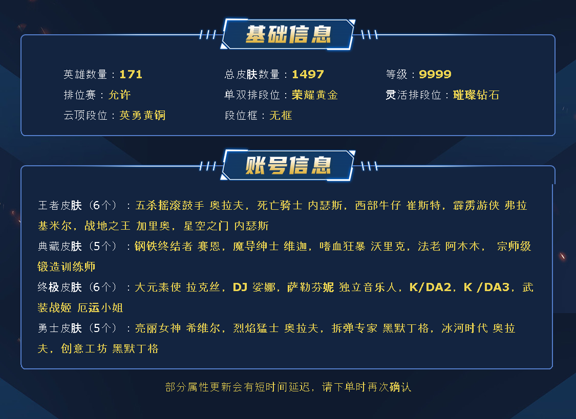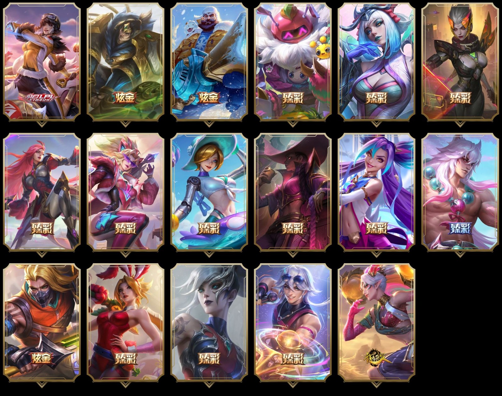 【重要皮肤】暗星女王黛安娜至臻 T1杰斯至臻 天龙之子伊泽瑞尔至臻 北极星钢影卡蜜尔至臻 心之钢永恩至臻 魔女阿卡丽至臻 DRX亚托克斯至臻 墨之影武者亚索至臻 绝息圣堂厄运小姐至臻 太空律动魔音海妖娜美至臻 灵魂莲华易至臻 海珀利安小队X09星环灵风迦娜至臻 星之守护者辛德拉至臻 海之歌萨勒芬妮至臻 西部魔影猎天使恶魔泰隆至臻 青花瓷拉克丝至臻 神凰行者烈羽焰凰霞至臻 女帝黛安娜至臻 战斗学院蕾欧娜至臻 太空律动璐璐至臻 魔女婕拉至臻 奥术师佐伊至臻 未来战士卢锡安至臻 真实伤害亚索至臻 真实伤害赛娜至臻 星之守护者索拉卡至臻 灵魂莲华提莫至臻 灵能特工伊泽瑞尔至臻 福牛守护者菲奥娜至臻 源计划逆流塞拉斯至臻 源计划阴劫至臻 王国机神玄武盖伦至臻 暗星墨菲特至臻 神龙尊者炎龙瑟提至臻 黑夜使者凯隐至臻 焰执事布兰德至臻 KDA二代卡莎至臻 KDA一代卡莎至臻 KDA阿狸至臻 KDA伊芙琳至臻 KDA阿卡丽至臻 战斗学院拉克丝至臻 烈焰美人薇恩至臻 魅惑女巫厄运小姐至臻 绒毛菲兹至臻 玉剑传说武剑仙至臻 玉剑传说武剑仙2022至臻 腥红之月亚托克斯至臻 腥红之月亚托克斯2022至臻 未来战士锤石至臻 未来战士锤石2022至臻 海克斯科技雷克顿 海克斯科技斯维因 海克斯科技波比 海克斯科技嘉文四世 海克斯科技崔丝塔娜 黎明使者卡尔玛 摄魂使者薇恩 胜利剑圣易 创星之灵璐璐 电玩女神厄运小姐 电玩女神阿狸 星之守护者伊泽瑞尔 玉剑传说舞剑仙 海珀利安小队Y03权天使卡蜜尔 玉剑传说神机花火 玉剑传说舞龙卫 星之守护者佐伊 龙的传人李青 银龙裁决泰隆 天龙之子斯莫德 烈焰仙子黛安娜 替父从军花木兰 神龙烈焰金克丝 北辰之威内瑟斯 美猴王孙悟空 玉净夜叉凯特琳 紫金罗刹莫甘娜 张辽文远 神龙之翼库奇 王国机神朱雀蕾欧娜 王国机神白虎贾克斯 王国机神玄武盖伦 福牛守护者德莱厄斯 福牛守护者菲奥娜 胜利女神瑟庄妮 胜利枪神卢锡安 胜利之剑亚托克斯 碎心之拳蔚 甜心之翎洛 甜心宝贝娑娜 穿心之剑菲奥娜 觅心游侠卢锡安 觅心萝莉金克丝 觅心猫猫悠米 冬季仙境奥莉安娜 冰雪驯鹿波比 冰雪风暴希维尔 持胡萝卜的雪人易 冰封王子蒙多 冰雪女神辛德拉 魄罗骑士瑟庄妮 平安夜女神娑娜 圣诞糖果棒厄运小姐 魅惑女巫妮蔻 魅惑女巫赛娜 魅惑女巫莫甘娜 魅惑女巫崔丝塔娜 魅惑女巫奈德丽 大魔法锅布里茨 南瓜头王子阿木木 海之歌奈德丽 海之歌永恩 海之歌泽丽 泳池派对佐伊 泳池派对奥莉安娜 泳池派对塔莉垭 泳池派对格雷福斯 泳池派对雷克顿 送披萨的小姐姐希维尔 鸡里奥 制胜金靴李青 制胜金球拉莫斯 EDG厄斐琉斯 EDG悠米 DWG凯南 DWG蕾欧娜 FPX锤石 FPX薇恩 iG卡蜜尔 iG卡莎 iG艾瑞莉娅 iG乐芙兰 iG菲奥娜 SSG纳尔 SSG塔莉垭 SSG伊泽瑞尔 SKTT1扎克 SKTT1辛德拉 SKTT1艾克 SKTT1奥拉夫 SKTT1卡莉丝塔 SSW泰隆 SSW辛吉德 SKTT1劫 SKTT1婕拉 SKTT1薇恩 暗杀星努努和威朗普 暗杀星伊泽瑞尔 暗杀星慎 Fnatic迦娜 Fnatic古拉加斯 冰雪节辛吉德 冰雪兽纳尔 防暴士兵辛吉德 防暴天使凯尔 钢铁之翼艾尼维亚 冠军典狱长锤石 冠军之血希瓦娜 鬼影森森茂凯 鬼影重重魔腾 海贼瑞兹 胡桃夹子萨科 警用试作体K9内瑟斯 魅惑女巫娜美 魅惑女巫悠米 密林猎手提莫 南瓜头费德提克 圣诞精灵崔丝塔娜 圣诞开心鬼提莫 圣诞狂欢基兰 圣诞狂欢努努和威朗普 圣诞老人古拉加斯 圣诞玩偶波比 圣诞驯鹿克格莫 外星装甲库奇 无头骑士赫卡里姆 喜庆之树茂凯 邪恶圣诞老人维迦 幸福女神乐芙兰 雪默丁格 野兽猎人瑟庄妮 野兽猎人泰达米尔 英勇玩具兵普朗克 勇者阿狸 征服者诺提勒斯 征服者韦鲁斯 暗影沃里克 冠军之箭艾希 阿木木主人不要我了 波比的巧克力工坊 都铎王朝图奇 十五周年纪念希维尔 十周年纪念安妮 源代码乐芙兰 神凰行者瑞羽圣凰艾尼维亚 胜利凤凰艾尼维亚 DJ娑娜 大元素使拉克丝 武装战姬厄运小姐 KDAALLOUT萨勒芬妮独立音乐人 KDAALLOUT萨勒芬妮明日新星 KDAALLOUT萨勒芬妮超级巨星