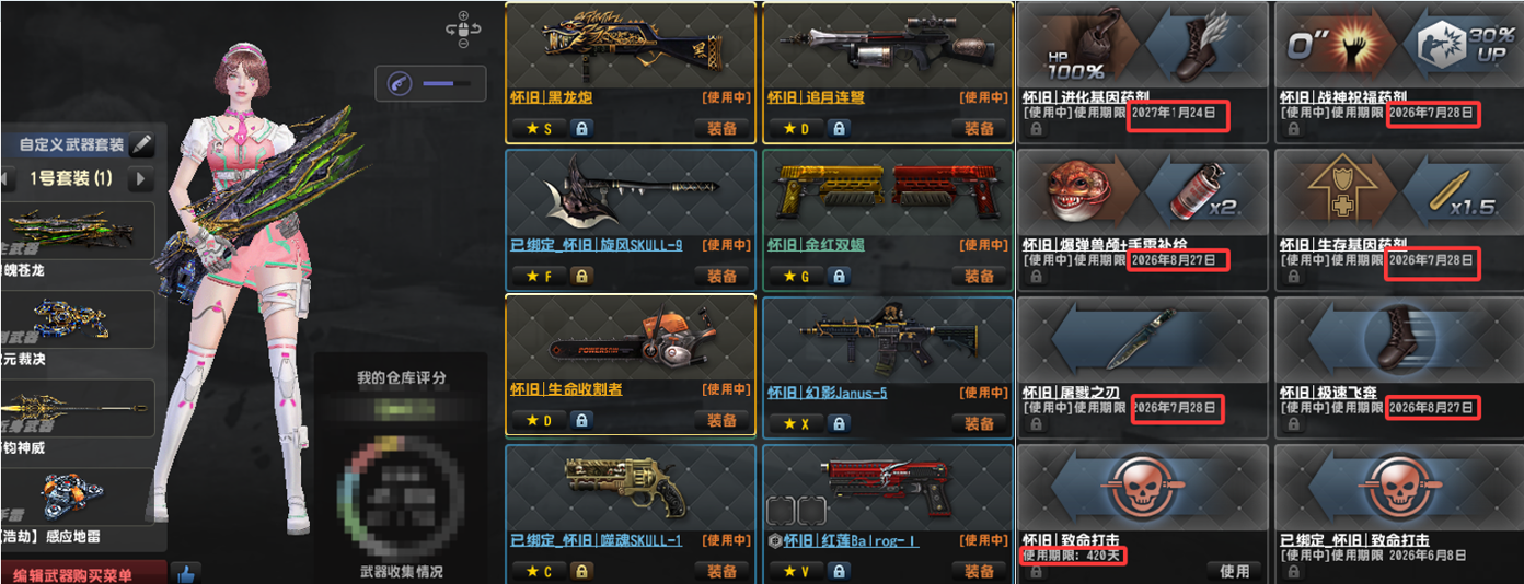 龙神万钧神威次元裁决●怀旧套弩电锯龙炮金红斧头●三闪电●维京套天巡●多赛季去雾