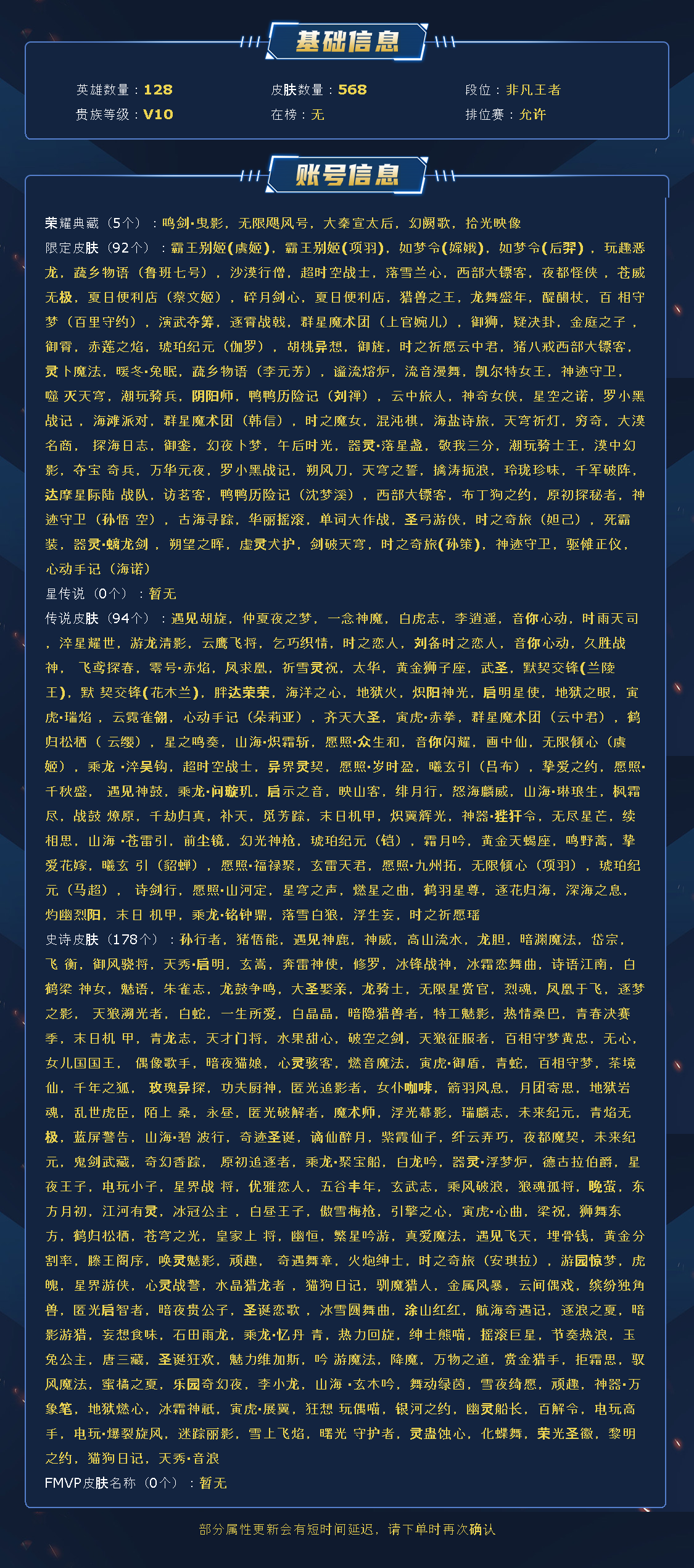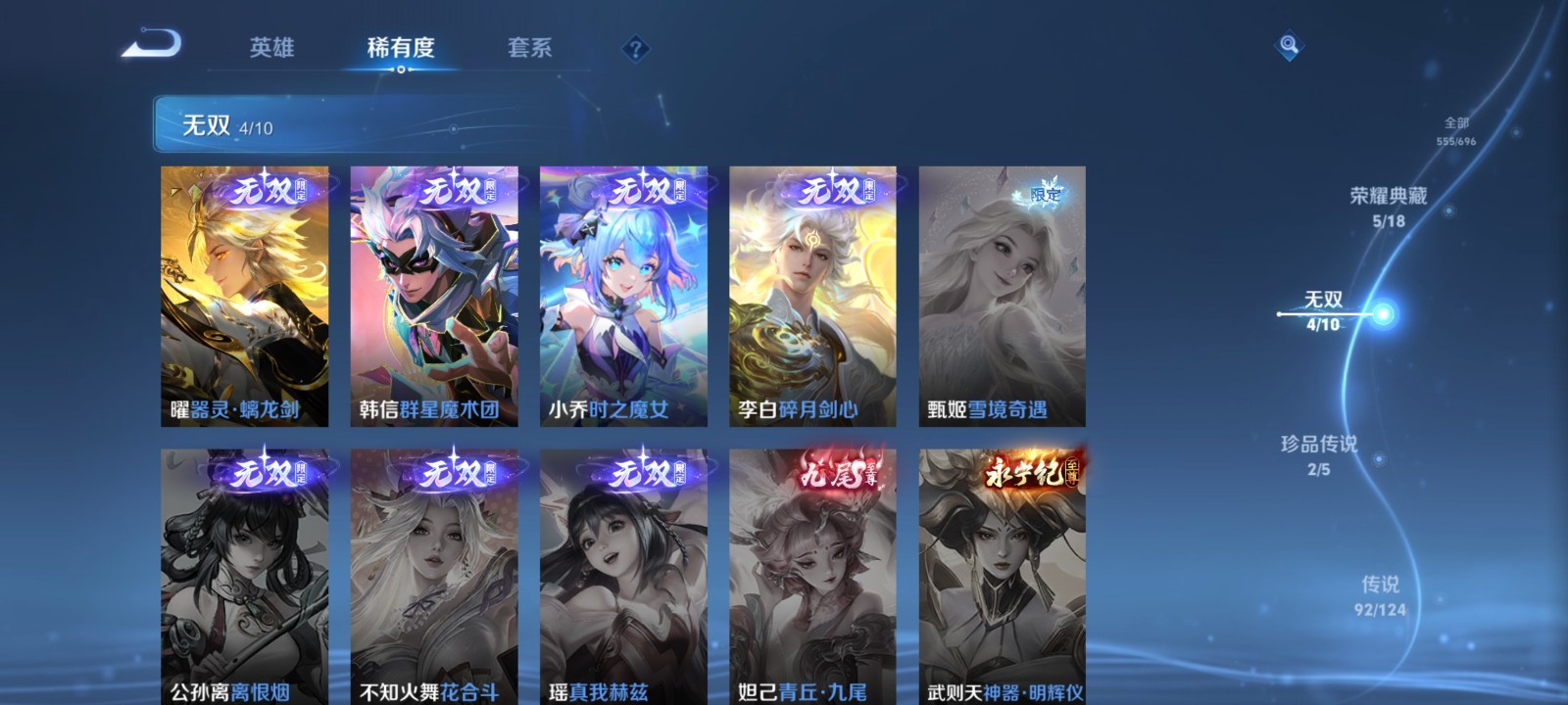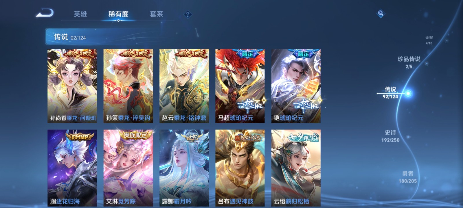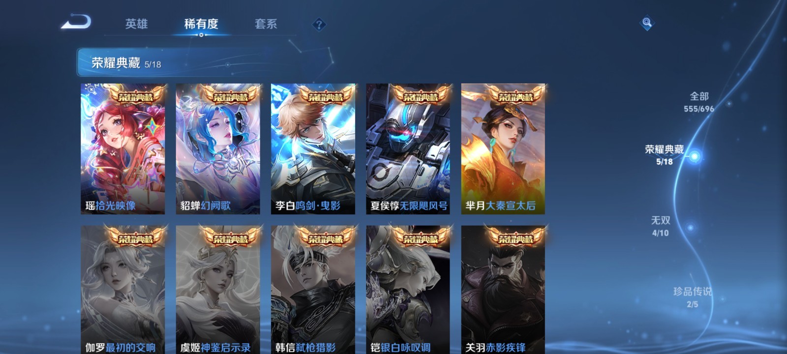 器灵·螭龙剑,愿照·九州拓,愿照·众生和,匿光追影者,群星魔术团(上官婉儿),乘龙·问璇玑,群星魔术团(韩信),心动手记(朵莉亚),落雪白狼,愿照·福禄聚,时之祈愿瑶,遇见神鼓,群星魔术团(云中君),涂山红红,逐花归海,器灵·落星盏,琥珀纪元(马超),幻阙歌,琥珀纪元(伽罗),鹤羽星尊,时之奇旅(孙策),曦玄引(貂蝉),碎月剑心,愿照·千秋盛,霜月吟,乘龙·淬吴钩,东方月初,拾光映像,乘龙·铭钟鼎,埋骨钱,深海之息,黄金天蝎座,玉兔公主,补天,愿照·岁时盈,乘龙·聚宝船,续相思,异界灵契,启示之音,乘龙·忆丹青,心动手记(海诺),鹤归松栖(云缨),愿照·山河定,时之魔女,傲雪梅枪