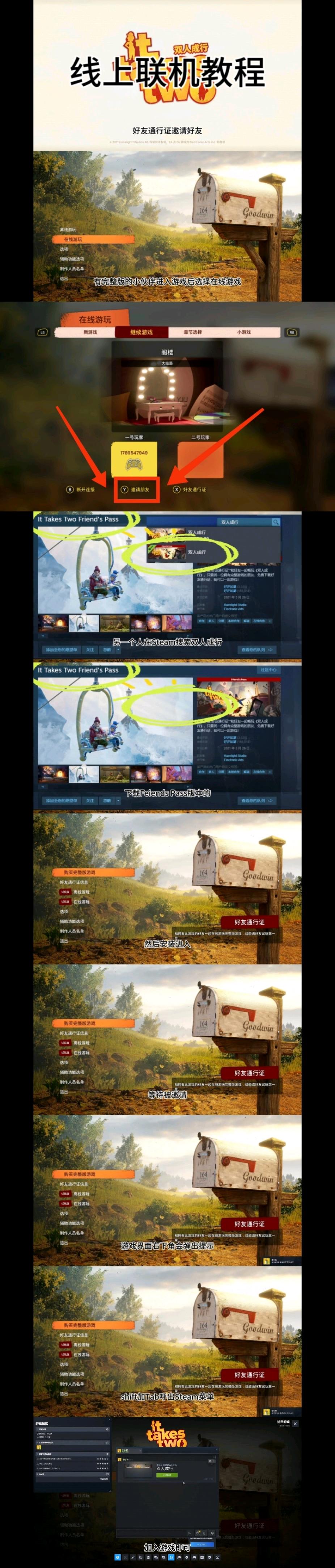 【线上联机】添加好友Steam账号,好友在steam搜索双人成行找到好友通行证版本,下载安装并进入游戏等待邀请。用该账号选择线上模式,通过steam邀请好友。好友右下角会弹出提示。呼出菜单键加入游戏即与好友可线上联机。