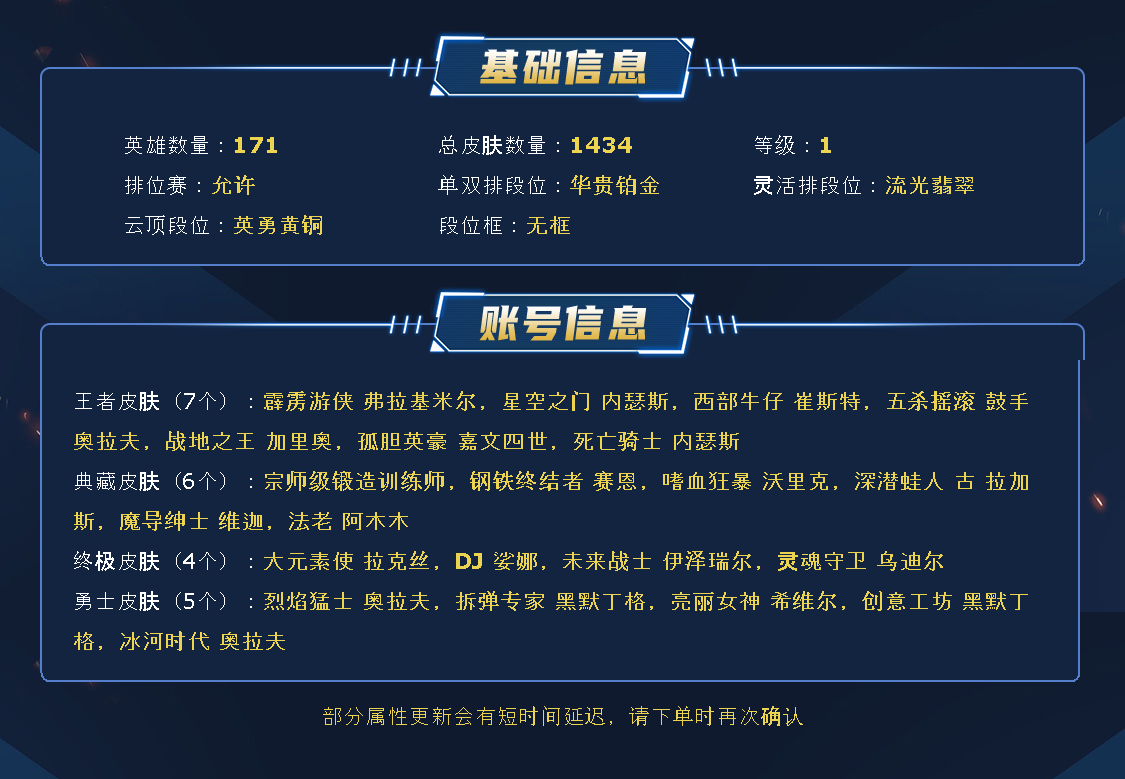 ~~喜欢记得收藏~~可排位~~1424皮全英雄丨1015原皮409炫彩~~租之前尽量查一下游戏ID,确保段位是您需要的,避免浪费您的时间~~请勿挂机逃跑故意送人头,谢谢合作,谢谢~~
