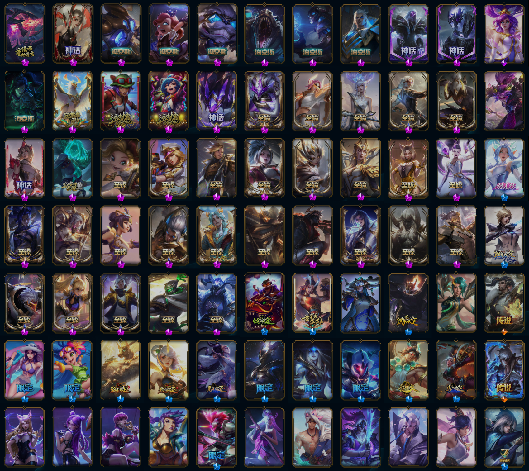 【传说皮肤】星之守护者拉克丝 血石领主弗拉基米尔 神龙尊者夜月幻龙亚索 大天使长米迦勒凯尔 苍穹之光韦鲁斯 魔幻卡牌崔斯特 神王德莱厄斯 恶魔之刃泰达米尔 西部魔影大小姐蕾欧娜 邪鸦魅影乐芙兰 灌篮高手德莱厄斯 银河魔装机神兰博 枯萎之壤泽拉斯 源计划林易 星之守护者洛 欧米伽小队幽灵特工 冰霜亚龙希瓦娜 神龙尊者昼日真龙亚索 双重冰晶艾尼维亚 炼狱魔犬内瑟斯 神拳李青 绅士科加斯 西部天使艾希 宇航员诺提勒斯 源计划毁灭派克 腥红之月鬼武姬阿卡丽 丧尸布兰德 战斗学院凯特琳 上古战魂魔腾 符文战熊沃利贝尔 泳池派对吉格斯 黎明使者永恩 真实伤害艾克 死亡骑士盖伦 日蚀骑士蕾欧娜 战地巨兽科加斯 钢铁之翼凯尔 第三类接触黑默丁格 西部魔影永恩 驯龙炮手崔丝塔娜 红色男爵库奇 女主播迦娜 冰川巨兽墨菲特 地狱行者孙悟空 黯晶凤凰艾尼维亚 苹果机器人布里茨 源计划净化薇恩 神龙尊者圣龙李青 黑夜使者亚索 铁哥们儿奥拉夫 星之守护者金克丝 提莫约德尔人的一大步 焰尾妖狐阿狸 金牌主播德莱文 鬼魂新娘莫甘娜 最终BOSS维迦 黯黑魔龙希瓦娜 合金巨兽努努和威朗普 恶魔男爵瑞兹 黎明使者锐雯 女皇艾希 天煞劫 烈焰雄心崔丝塔娜 地狱之门卫士加里奥 黎明使者索拉卡 钢铁军团盖伦 蔷薇绅士杰斯 奥德赛凯隐 战斗学院伊泽瑞尔 约德尔国队长提莫 西部魔影卢锡安 暗星锤石 战地机甲厄加特 至高天派克 电玩女神娑娜 战场女武神凯尔 律政大亨蒙多 神王盖伦 冰霜之刃艾瑞莉娅 未来战士凯特琳 女校长菲奥娜 霸天异形卡兹克 霸天零式赛恩 女警狙击凯特琳