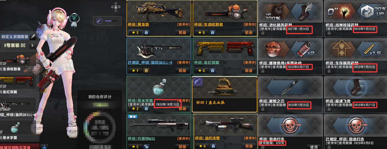 5. 更新:怀旧三件套黑龙炮,斧头,恒宇双星!已去黑雾!赛季12到21赛季(缺第13赛季),主要配件武器6阶,其他最少5阶,强化武器全满!