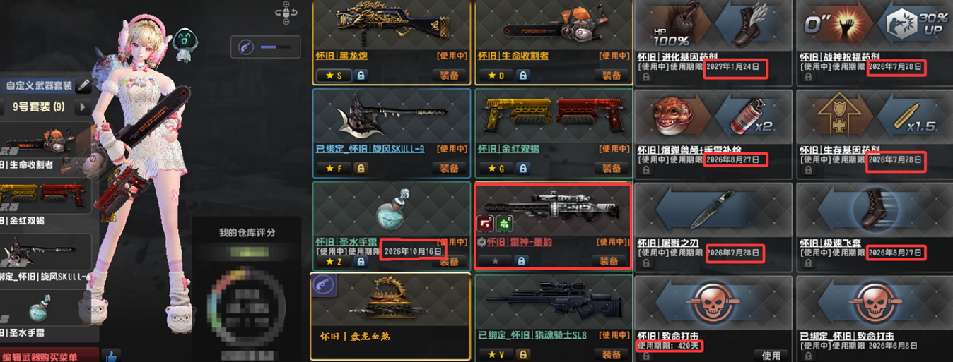 3.除紫钻武器外,有紫钻之外的:已去黑雾!特典狙,特典加特林!赛季14到21(缺17)配件武器全满,强化武器全满!