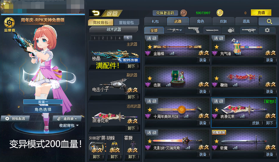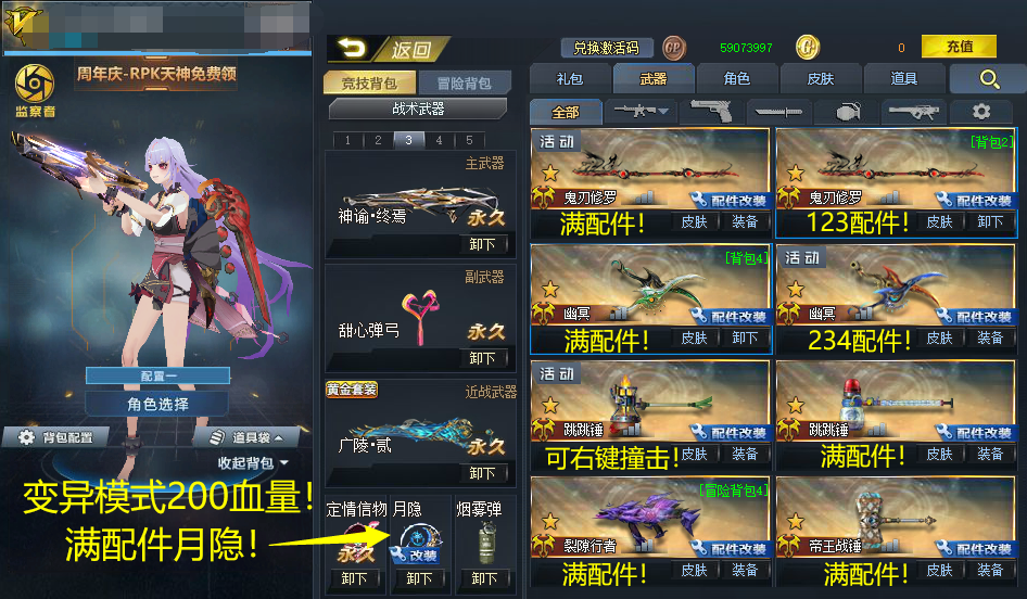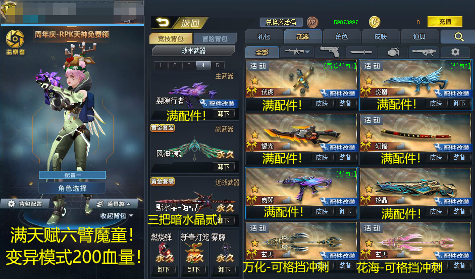 配件武器:双玄天!双幽冥!双跳跳锤!双鬼刃修罗!满裂隙行者!满帝王战锤!满伏虎!满炎凰!满耀光!满幻锋!满岚翼!满棱晶!