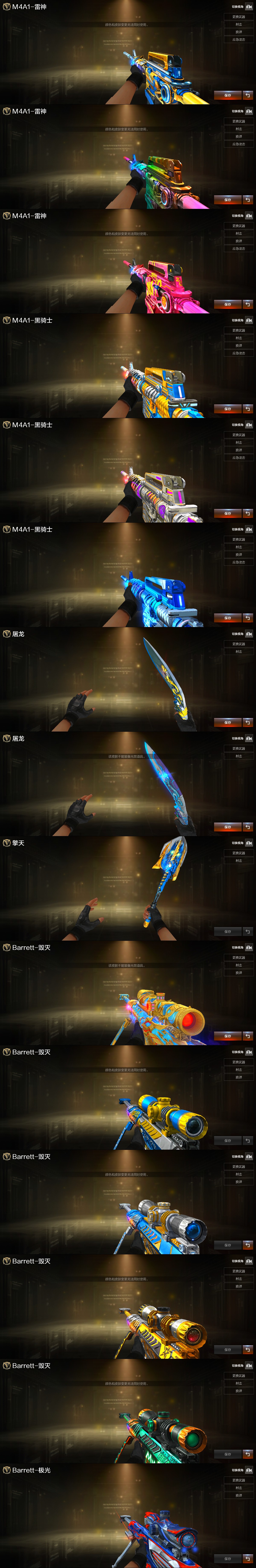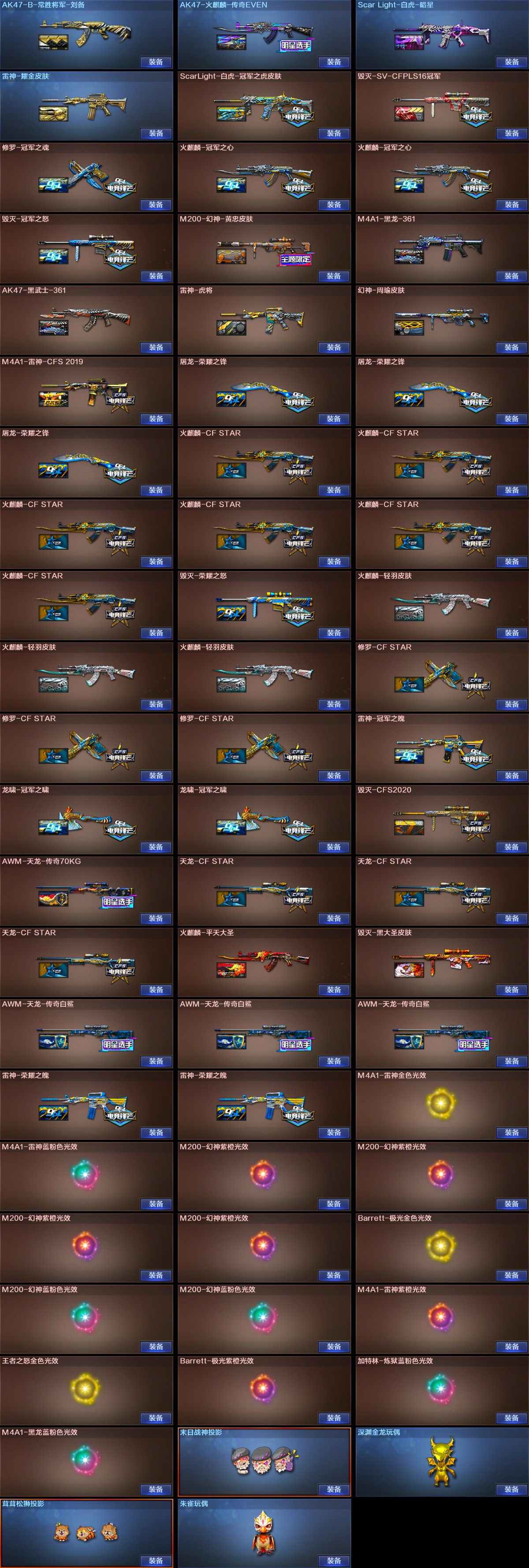 只要不开随便玩,排面拉满【稀有武器】:传说光耀/传说暗裔/传说夜影/传说灵眸/M200-幻神(3)/Kar98K-星神/VSK-94-金蚀/G36C-幻影/ScarLight-白虎/M14EBR-玄武/M4A1-青龙/HK417-朱雀/QBZ03-天罚/M4A1-夜魔(2)/AK47-雷暴(2)/雷霆之契/USP-雷暴(4)/COP-堕天神/破空枪刃-夜魔/柯尔特-竞技荣光/破空枪刃/沙鹰-幻兽(4)/荣耀世冠-柯尔特/柯尔特-冠军之特(2)/QBZ03-云龙/QBZ03-金色蔷薇/QBZ95-幻兽/AK47-火麒麟(7)/M4A1-黑龙(2)/M4A1-雷神(8)/M4A1-黑骑士(8)/AK47-无影(2)/AK47-黑武士/荣耀世冠-火麒麟/荣耀世冠-雷神/Barrett-毁灭(4)/Barrett-极光(2)/AWM-裁决/M200-竞技荣光/RPK-盘龙(6)/加特林-炼狱(3)/汤姆逊-烈龙(6)/AA-12-雷霆/炽芒蝶刃/斩神刀-雷暴(2)/马来剑-夜魔/幻灵之锋/擎天-竞技荣光/云龙扇/女皇利刃-幻兽