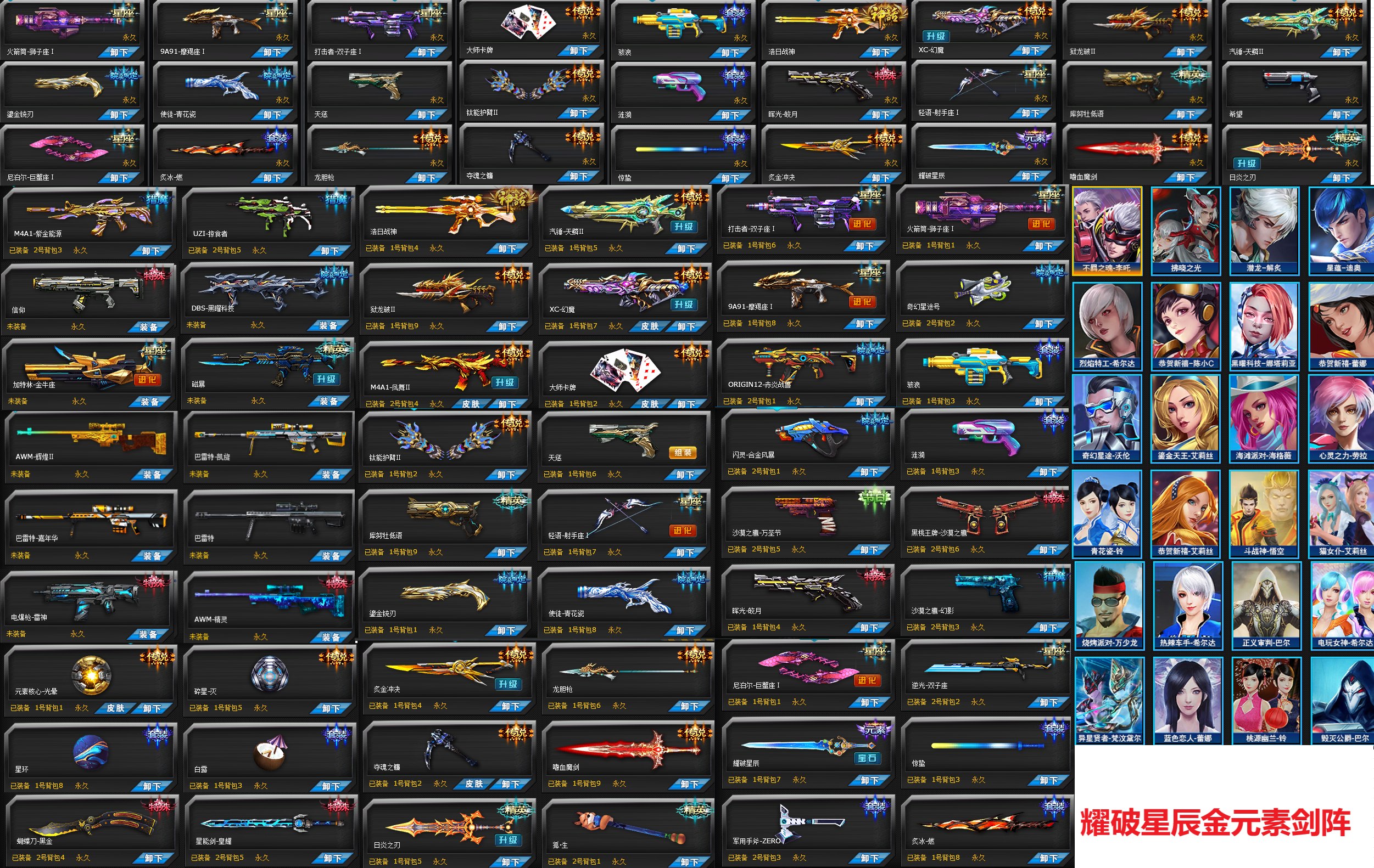 狂蛇背包双子座狮子座魔羯座奇幻星图号,掠食者金牛座超级玩家,护臂羊枪射手座鎏金铳刃青花瓷闪灵合金风暴皎月,炙金冲决龙胆枪夺魂之镰嗜血魔剑巨蟹座蝴蝶刀黑金李吒天启,悟空雷娜毁灭公爵巴尔异星贤者。