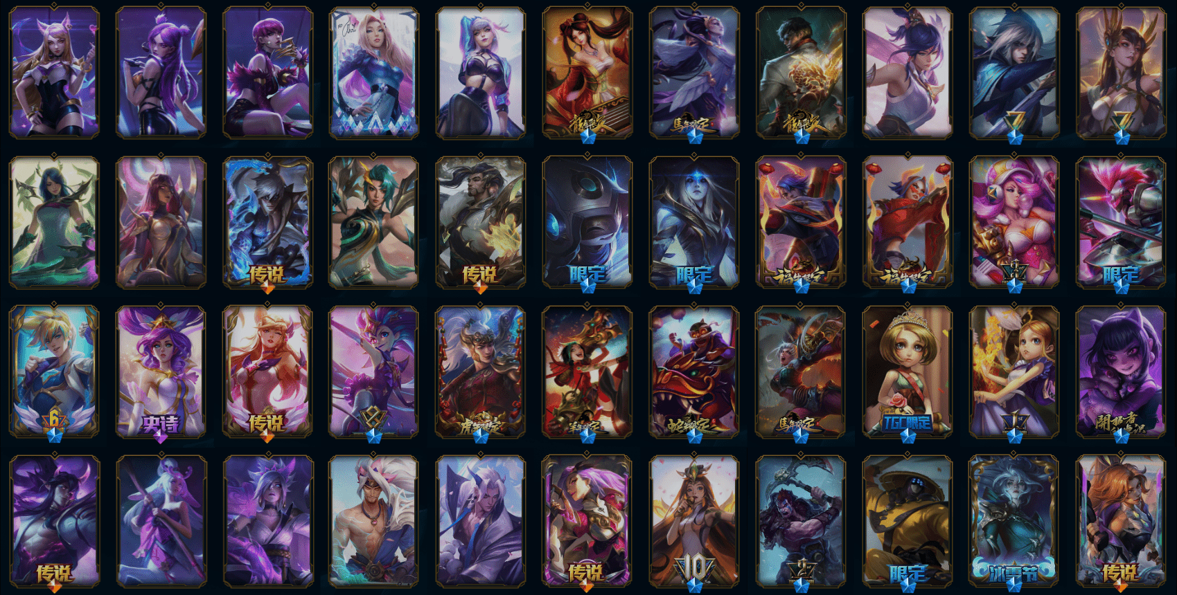 【传说皮肤】双重冰晶艾尼维亚 灵魂莲华锤石 神龙尊者昼日真龙亚索 大天使长米迦勒凯尔 源计划林易 黑夜使者索拉卡 女皇艾希 上古战魂魔腾 黯晶凤凰艾尼维亚 腥红之月鬼武姬阿卡丽 陆地王者4WD布里茨 恶魔之刃泰达米尔 女主播迦娜 黎明使者索拉卡 黑夜使者亚索 金牌主播德莱文 宇航员诺提勒斯 焰尾妖狐阿狸 灌篮高手德莱厄斯 钢铁之翼凯尔 苍穹之光韦鲁斯 冰霜亚龙希瓦娜 烈焰雄心崔丝塔娜 神龙尊者夜月幻龙亚索 女校长菲奥娜 暗星锤石 丧尸布兰德 屠龙勇士潘森 霸天零式赛恩 未来战士凯特琳 暗星女王拉克丝 炼狱魔犬内瑟斯 约德尔国队长提莫 源计划超体莫德凯撒 枯萎之壤泽拉斯 银河魔装机神兰博 西部天使艾希 欧米伽小队幽灵特工 恶魔男爵瑞兹 冰川巨兽墨菲特 战斗学院凯特琳 冰霜之刃艾瑞莉娅 黯黑魔龙希瓦娜 星之守护者拉克丝 死亡骑士盖伦 泳池派对吉格斯 星之守护者霞 合金巨兽努努和威朗普 铁哥们儿奥拉夫 神龙尊者圣龙李青 女警狙击凯特琳 耀星女神拉克丝 地狱之门卫士加里奥 律政大亨蒙多 星之守护者阿狸 红色男爵库奇 战地巨兽科加斯 天煞劫 源计划泯灭雷克顿 战场女武神凯尔 电玩女神娑娜 驯龙学者黑默丁格 偶像歌手阿狸 真实伤害艾克 源计划联合艾希 蔷薇绅士杰斯 鬼魂新娘莫甘娜 至尊魔女莫甘娜 霸天异形卡兹克 战地机甲厄加特 钢铁军团盖伦 魔幻卡牌崔斯特 邪鸦魅影乐芙兰 女帝卡特琳娜 西部魔影卢锡安 黎明使者锐雯 提莫约德尔人的一大步 幻灵战斗队长厄运小姐 源计划净化薇恩 星之守护者金克丝