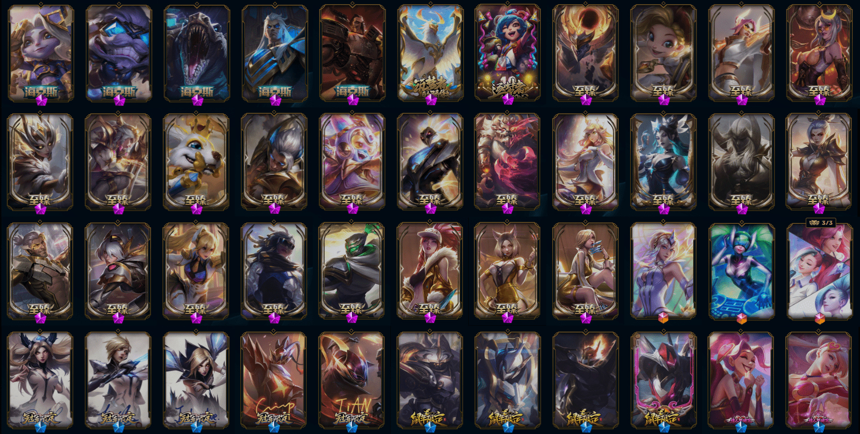 【重要皮肤】星之守护者辛德拉至臻 女帝黛安娜至臻 战斗学院蕾欧娜至臻 太空律动璐璐至臻 魔女婕拉至臻 奥术师佐伊至臻 真实伤害赛娜至臻 星之守护者索拉卡至臻 福牛守护者菲奥娜至臻 源计划逆流塞拉斯至臻 暗星墨菲特至臻 神龙尊者炎龙瑟提至臻 神龙尊者均衡之龙沃利贝尔至臻 征服者贾克斯至臻 KDA阿狸至臻 KDA阿狸2022至臻 KDA伊芙琳至臻 KDA伊芙琳2022至臻 KDA阿卡丽至臻 KDA阿卡丽2022至臻 烈焰美人薇恩至臻 烈焰美人薇恩2022至臻 源计划正义艾瑞莉娅至臻 源计划正义艾瑞莉娅2022至臻 绒毛菲兹至臻 绒毛菲兹2022至臻 玉剑传说武剑仙至臻 玉剑传说武剑仙2022至臻 腥红之月亚托克斯至臻 腥红之月亚托克斯2022至臻 未来战士锤石至臻 未来战士锤石2022至臻 海克斯科技雷克顿 海克斯科技斯维因 海克斯科技吉格斯 海克斯科技波比 海克斯科技崔丝塔娜 恐惧新星德莱厄斯 胜利剑圣易 胜利女神娑娜 胜利之王泰达米尔 胜利巨口克格莫 哥特萝莉安妮 舞会公主安妮 创星之灵璐璐 奥斯曼大帝普朗克 奥斯曼大帝泰达米尔 生化领主泰达米尔 养蜂人辛吉德 安妮梦游仙境 勇敢的心德莱厄斯 电玩女神厄运小姐 电玩女神阿狸 星之守护者伊泽瑞尔 玉剑传说无影 玉剑传说舞剑仙 神凰行者幽羽玄凰萨勒芬妮 海珀利安小队Y03权天使卡蜜尔 星之守护者佐伊 龙的传人李青 猛虎下山赵信 替父从军花木兰 神龙烈焰金克丝 碧玉之牙卡西奥佩娅 古琴余韵娑娜 南天之怒沃里克 定海神珍孙悟空 玉净夜叉凯特琳 紫金罗刹莫甘娜 广寒仙子嫦娥 虎痴之拳蔚 司马懿仲达 烈焰美人薇恩 神龙之翼库奇 王国机神青龙德莱文 王国机神朱雀蕾欧娜 王国机神苍狼瑟提 王国机神白虎贾克斯 福牛守护者安妮 福牛守护者厄斐琉斯 福牛守护者德莱厄斯 福牛守护者阿利斯塔 福牛守护者嘉文四世 福牛守护者菲奥娜 胜利枪神卢锡安 胜利之剑亚托克斯 甜心宝贝安妮 甜心宝贝娑娜 觅心之翼奎因 觅心萝莉金克丝 北极星神黛安娜 寒冬精灵璐璐 雪球也能爆炸吉格斯 圣诞老人德莱文 冬季仙境卡尔玛 冰雪女神辛德拉 魄罗骑士瑟庄妮 夺命美人卡特琳娜 平安夜女神娑娜 圣诞糖果棒厄运小姐 魅惑女巫崔丝塔娜 魅惑女巫奈德丽 魅惑女巫伊莉丝 死亡誓约卡特琳娜 勇敢的心德莱厄斯 泳池派对普朗克 泳池派对奥莉安娜 泳池派对塔莉垭 泳池派对厄运小姐 泳池派对塔里克 泳池派对菲奥娜 泳池派对格雷福斯 泳池派对李青 泳池派对蕾欧娜 泳池派对雷克顿 泳池派对瑟提 电玩战魂赫卡里姆 御星魔矢艾希 DWG凯南 FPX锤石 FPX薇恩 FPX李青 FPX普朗克 FPX墨菲特 iG洛 iG卡莎 iG艾瑞莉娅 iG菲奥娜 SSG洛 SSG纳尔 SSG嘉文四世 SKTT1烬 SKTT1辛德拉 SKTT1艾克 SKTT1阿利斯塔 SKTT1卡莉丝塔 SKTT1瑞兹 SKTT1阿兹尔 SKTT1伊莉丝 SKTT1雷克顿 SSW锤石 SSW雷恩加尔 SSW泰隆 SSW图奇 SSW辛吉德 SKTT1贾克斯 SKTT1劫 SKTT1婕拉 SKTT1李青 SKTT1薇恩 暗杀星奥莉安娜 暗杀星蒙多 暗杀星努努和威朗普 暗杀星伊泽瑞尔 暗杀星慎 Fnatic迦娜 Fnatic库奇 Fnatic古拉加斯 Fnatic嘉文四世 Fnatic卡尔萨斯 冰雪节格雷福斯 防暴士兵格雷福斯 防暴士兵辛吉德 防暴天使凯尔 钢铁之翼艾尼维亚 冠军典狱长锤石 冠军掠夺者卡兹克 冠军之矛卡莉丝塔 冠军之刃锐雯 冠军之刃锐雯2016 冠军之血希瓦娜 冠军之隐劫 春晖神女奇亚娜 鬼影森森茂凯 鬼影重重魔腾 海贼瑞兹 胡桃夹子萨科 惊悚派对阿木木 警用试作体K9内瑟斯 蓝色忧郁崔斯特 蒙多蒙多 密林猎手提莫 南瓜头费德提克 女猎手希维尔 破空枪骑孙悟空 圣诞精灵崔丝塔娜 圣诞开心鬼提莫 圣诞狂欢基兰 圣诞狂欢努努和威朗普 圣诞老人古拉加斯 圣诞玩偶波比 圣诞驯鹿克格莫 糖果使徒费德提克 外星装甲库奇 卧虎藏龙贾克斯 无头骑士赫卡里姆 喜庆之树茂凯 邪恶圣诞老人维迦 幸福女神乐芙兰 雪默丁格 雪球也能爆炸吉格斯 雪装奈德丽 野兽猎人德莱文 野兽猎人瑟庄妮 野兽猎人泰达米尔 英勇玩具兵普朗克 永恒之森乐芙兰 征服者阿利斯塔 征服者卡尔玛 暗影沃里克 阿木木主人不要我了 2021全球总决赛嘉文四世 波比的巧克力工坊 地底世界崔斯特 都铎王朝图奇 十五周年纪念希维尔 十周年纪念安妮 源代码乐芙兰 神凰行者瑞羽圣凰艾尼维亚 胜利凤凰艾尼维亚 DJ娑娜 大元素使拉克丝 未来战士伊泽瑞尔 KDAALLOUT萨勒芬妮独立音乐人 KDAALLOUT萨勒芬妮明日新星 KDAALLOUT萨勒芬妮超级巨星