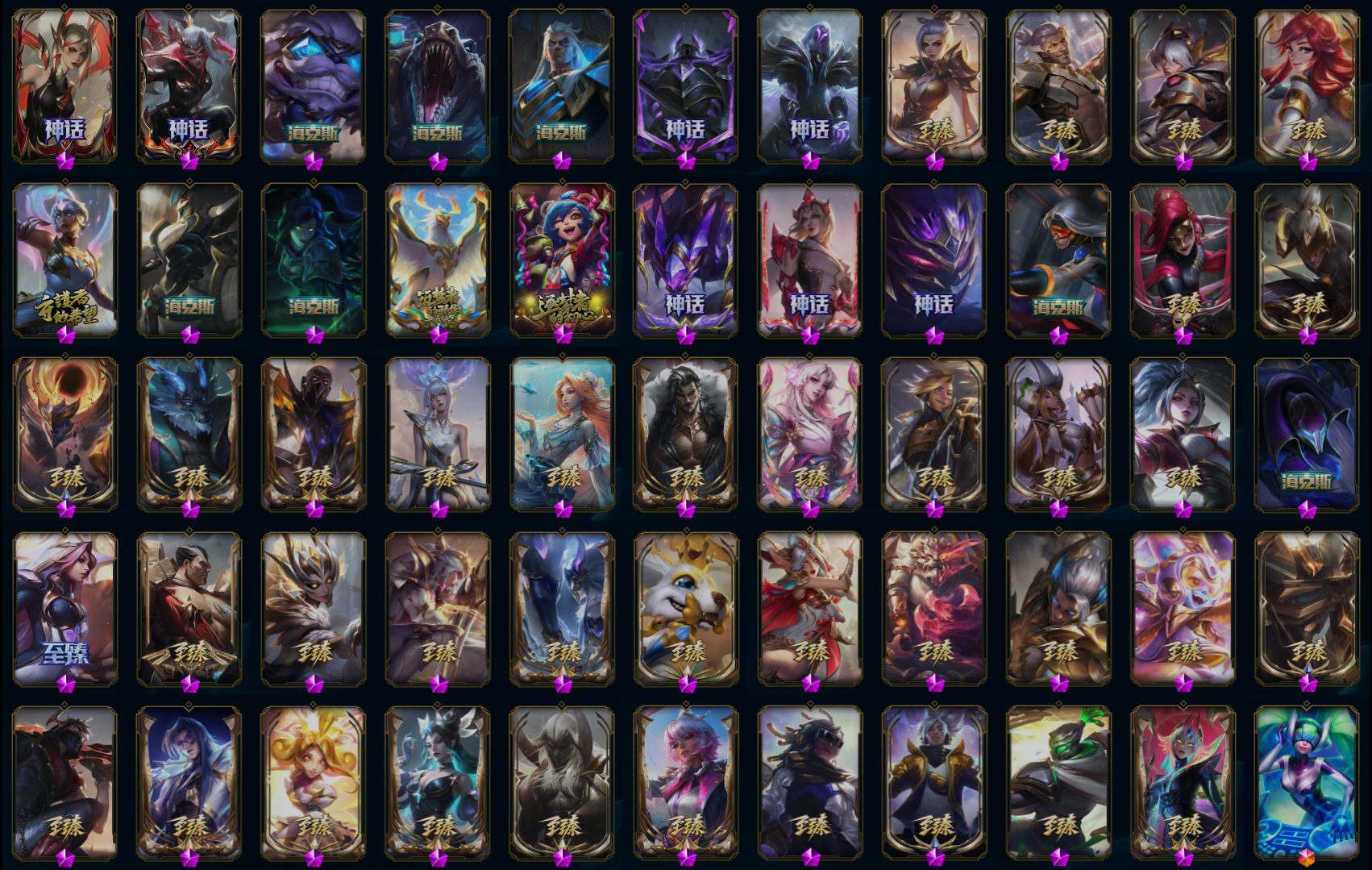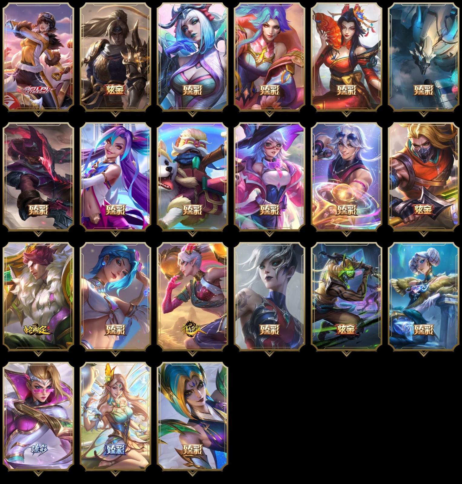 【重要皮肤】灵魂莲华拉克丝至臻 战斗学院奇亚娜至臻 凯旋将军德莱厄斯至臻 黑色玫瑰假面舞会卡特琳娜至臻 狼神英灵斯维因至臻 T1杰斯至臻 至高天凯尔至臻 青花瓷千珏至臻 心之钢永恩至臻 魔女阿卡丽至臻 斗魂觉醒派克至臻 DRX亚托克斯至臻 绝息圣堂厄运小姐至臻 北极星使者沃里克至臻 至高天奎桑提至臻 海珀利安小队X09星环灵风迦娜至臻 星之守护者辛德拉至臻 海之歌萨勒芬妮至臻 西部魔影猎天使恶魔泰隆至臻 神凰行者烈羽焰凰霞至臻 女帝黛安娜至臻 太空律动璐璐至臻 魔女婕拉至臻 真实伤害亚索至臻 真实伤害赛娜至臻 灵能特工伊泽瑞尔至臻 源计划逆流塞拉斯至臻 王国机神玄武盖伦至臻 暗星墨菲特至臻 神龙尊者炎龙瑟提至臻 神龙尊者均衡之龙沃利贝尔至臻 征服者贾克斯至臻 KDA二代卡莎至臻 KDA一代卡莎至臻 KDA阿狸至臻 KDA伊芙琳至臻 KDA阿卡丽至臻 战斗学院拉克丝至臻 魅惑女巫厄运小姐至臻 星之守护者妮蔻至臻 源计划正义艾瑞莉娅至臻 绒毛菲兹至臻 绒毛菲兹2022至臻 玉剑传说武剑仙至臻 腥红之月亚托克斯至臻 腥红之月亚托克斯2022至臻 黑夜使者李青至臻 黑夜使者李青2022至臻 殿堂传奇薇恩 殿堂传奇乐芙兰 灰烬骑士莫德凯撒 灰烬骑士派克 海克斯科技瑟庄妮 海克斯科技雷克顿 海克斯科技斯维因 海克斯科技吉格斯 海克斯科技阿木木 海克斯科技魔腾 水晶泰坦诺提勒斯 水晶掠夺者卡兹克 水晶圣骑艾希 黎明使者卡尔玛 零之枪骑赫卡里姆 摄魂使者薇恩 新创战纪希维尔 胜利剑圣易 胜利女神娑娜 胜利女神希维尔 胜利之王泰达米尔 胜利巨口克格莫 钢铁军团拉克丝 荣誉使者玛尔扎哈 女帝厄运小姐 玉剑传说神机花火 玉剑传说无劫 玉剑传说舞龙卫 玉剑传说翼剑仙 点心宝贝阿木木 银龙裁决泰隆 天龙之子斯莫德 龙腾虎跃瑟提 南天之怒沃里克 美猴王孙悟空 广寒仙子嫦娥 虎痴之拳蔚 张辽文远 神龙之翼库奇 王国机神苍狼瑟提 王国机神白虎贾克斯 福牛守护者厄斐琉斯 胜利女神瑟庄妮 胜利之树茂凯 胜利机器人布里茨 胜利女神奥莉安娜 胜利枪神格雷福斯 胜利枪神卢锡安 胜利女神伊莉丝 胜利之剑亚托克斯 甜心之翎洛 觅心游侠卢锡安 觅心女王艾希 觅心之翼奎因 觅心萝莉金克丝 幽梦玫瑰辛德拉 水晶玫瑰婕拉 双城之战2幸存者杰斯 北极星发明家塞拉斯 北极星神黛安娜 北极星守望者佐伊 冬境仙灵索拉卡 冬季仙境奥莉安娜 冰雪女神辛德拉 魄罗骑士瑟庄妮 夺命美人卡特琳娜 平安夜女神娑娜 圣诞糖果棒厄运小姐 魅惑女巫崔丝塔娜 魅惑女巫伊莉丝 泳池派对奥莉安娜 泳池派对黑默丁格 泳池派对格雷福斯 泳池派对李青 泳池派对蕾欧娜 泳池派对雷克顿 泳池派对瑟提 电玩战魂赫卡里姆 鸡里奥 克格汪 DWG烬 DWG奈德丽 FPX锤石 iG卡蜜尔 iG卡莎 iG乐芙兰 SSG纳尔 SKTT1辛德拉 SKTT1奥拉夫 SKTT1卡莉丝塔 SKTT1瑞兹 SKTT1阿兹尔 SSW锤石 SSW泰隆 SKTT1劫 SKTT1李青 暗杀星伊泽瑞尔 暗杀星慎 Fnatic迦娜 Fnatic库奇 Fnatic古拉加斯 Fnatic嘉文四世 冰雪节玛尔扎哈 冰雪节辛吉德 冰雪兽纳尔 防暴士兵格雷福斯 防暴士兵辛吉德 防暴天使凯尔 钢铁之翼艾尼维亚 冠军掠夺者卡兹克 冠军之刃锐雯2016 冠军之血希瓦娜 鬼影重重魔腾 红桃杰克崔斯特 胡桃夹子萨科 惊悚派对阿木木 警用试作体K9内瑟斯 魅惑女巫悠米 蒙多蒙多 密林猎手提莫 圣诞精灵崔丝塔娜 圣诞开心鬼提莫 圣诞狂欢基兰 圣诞狂欢努努和威朗普 圣诞老人古拉加斯 圣诞玩偶波比 圣诞驯鹿克格莫 无头骑士赫卡里姆 喜庆之树茂凯 邪恶圣诞老人维迦 雪默丁格 英勇玩具兵普朗克 勇者阿狸 暗影沃里克 机械迷城加里奥 魅惑女巫波比 魅惑女巫菲奥娜 阿木木主人不要我了 2023全球总决赛雷克顿 2021全球总决赛嘉文四世 波比的巧克力工坊 都铎王朝图奇 十周年纪念安妮 源代码乐芙兰 神凰行者瑞羽圣凰艾尼维亚 胜利凤凰艾尼维亚 斗魂觉醒佛耶戈 暗裔英雄盖伦 DJ娑娜 灵魂守卫乌迪尔 武装战姬厄运小姐 绝息圣堂洛