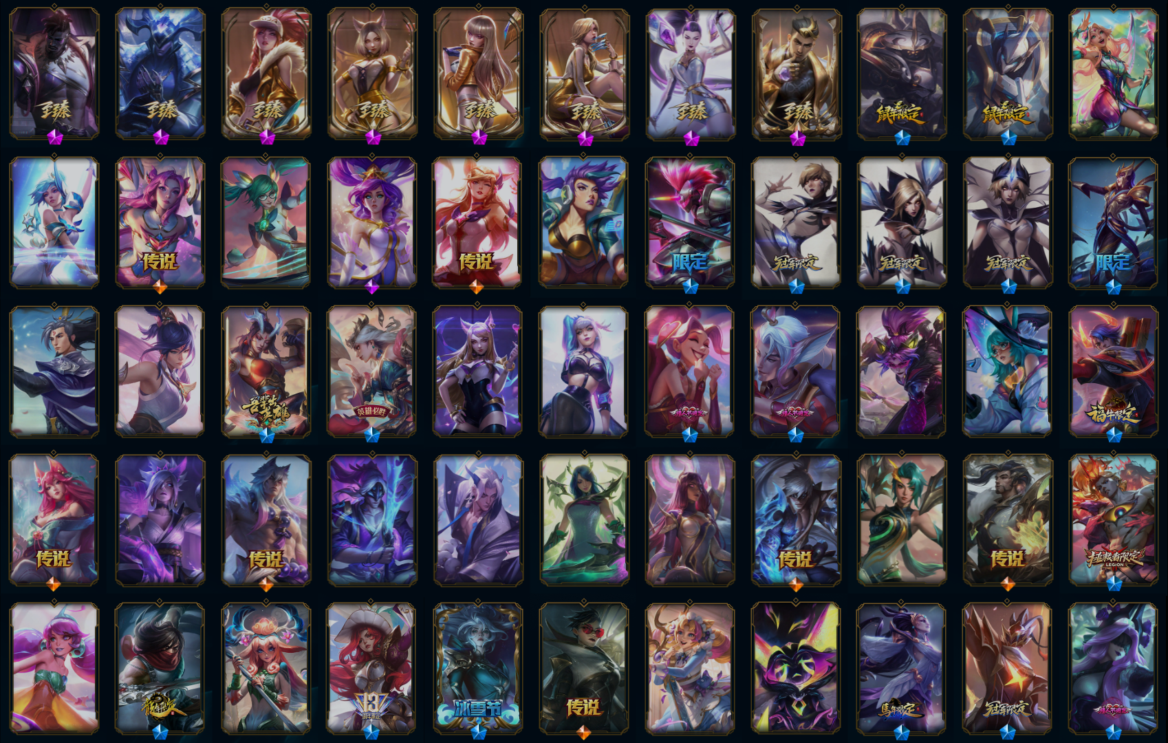 【传说皮肤】黯晶凤凰艾尼维亚 盒子猫萨科 太空律动猫猫布里和里茨 源计划毁灭派克 至尊魔女莫甘娜 源计划泯灭雷克顿 神龙尊者圣龙李青 最终BOSS维迦 天煞劫 符文战熊沃利贝尔 欧米伽小队幽灵特工 双重冰晶艾尼维亚 源计划净化薇恩 上古战魂魔腾 枯萎之壤泽拉斯 战地机甲厄加特 金牌主播德莱文 西部天使赛娜 灵能特工娑娜 暗星尊烬 焰尾妖狐阿狸 黎明使者锐雯 红色男爵库奇 腥红之月鬼武姬阿卡丽 耀星女神拉克丝 月蚀骑士蕾欧娜 源计划超体莫德凯撒 西部天使艾希 源计划联合艾希 星之守护者阿卡丽 光明哨兵薇恩 神拳李青 神王盖伦 灵魂莲华阿狸 驯龙学者黑默丁格 西部魔影大小姐蕾欧娜 战斗学院凯特琳 战场女武神凯尔 星之守护者阿狸 地狱之门卫士加里奥 偶像歌手阿狸 战斗学院伊泽瑞尔 星之守护者拉克丝 铁哥们儿奥拉夫 灵魂莲华瑟提 奥德赛凯隐 神龙尊者昼日真龙亚索 星之守护者金克丝 光明哨兵格雷福斯 星之守护者卡莎 黑夜使者索拉卡 恶魔男爵瑞兹 泳池派对吉格斯 星之守护者霞 魔女伊芙琳 死亡骑士盖伦 地狱行者孙悟空 钢铁军团盖伦 女主播迦娜 神王德莱厄斯 女警狙击凯特琳 日蚀骑士蕾欧娜 电玩女神娑娜 合金巨兽努努和威朗普 女皇艾希 大天使长米迦勒凯尔 冰川巨兽墨菲特 暗星锤石 冰霜亚龙希瓦娜 源计划林易 宇航员诺提勒斯 苍穹之光韦鲁斯 苹果机器人布里茨 真实伤害艾克 霸天异形卡兹克 炼狱魔犬内瑟斯 银河魔装机神兰博 丧尸布兰德 西部魔影卢锡安 冰霜之刃艾瑞莉娅 陆地王者4WD布里茨 绅士科加斯 灌篮高手德莱厄斯 霸天零式赛恩 屠龙勇士潘森 女校长菲奥娜 第三类接触黑默丁格 魔幻卡牌崔斯特 黯黑魔龙希瓦娜