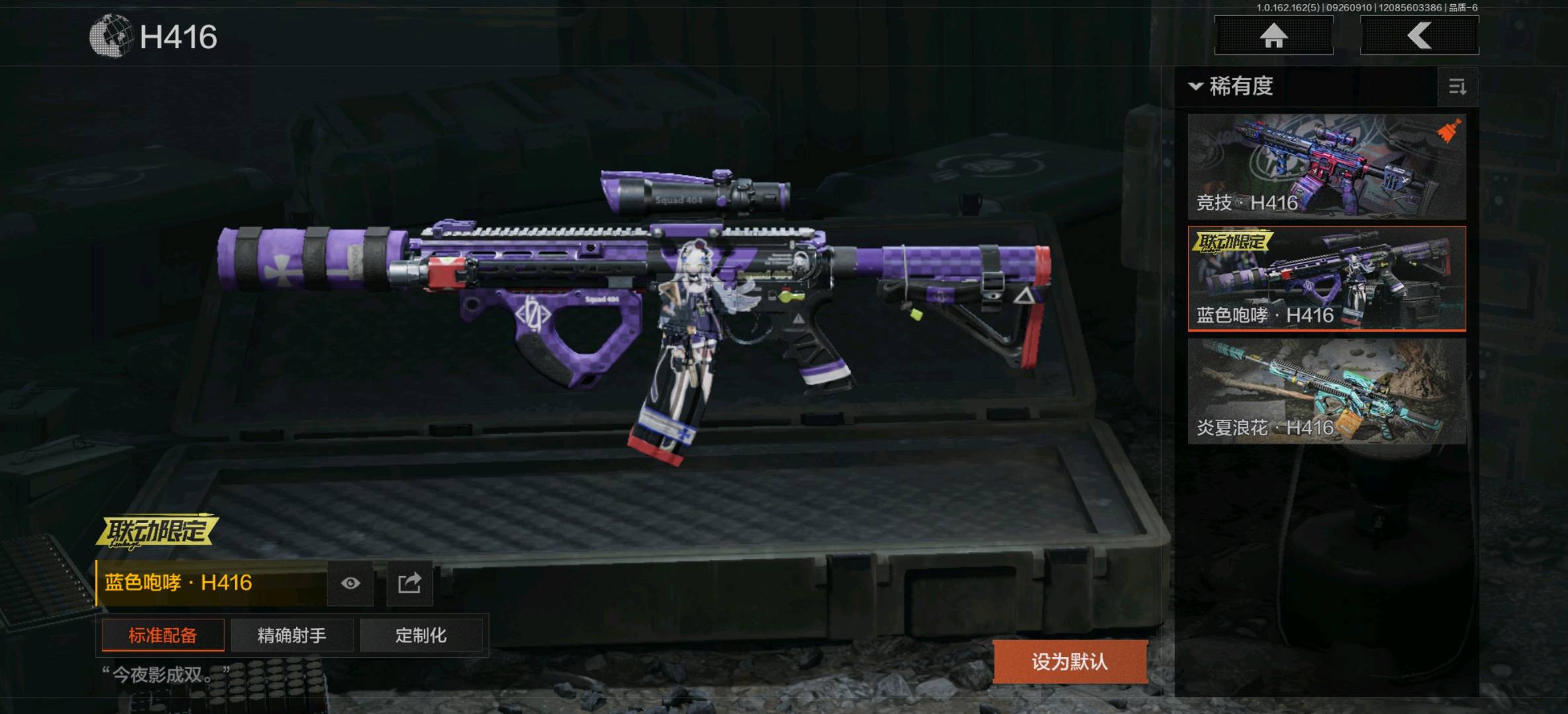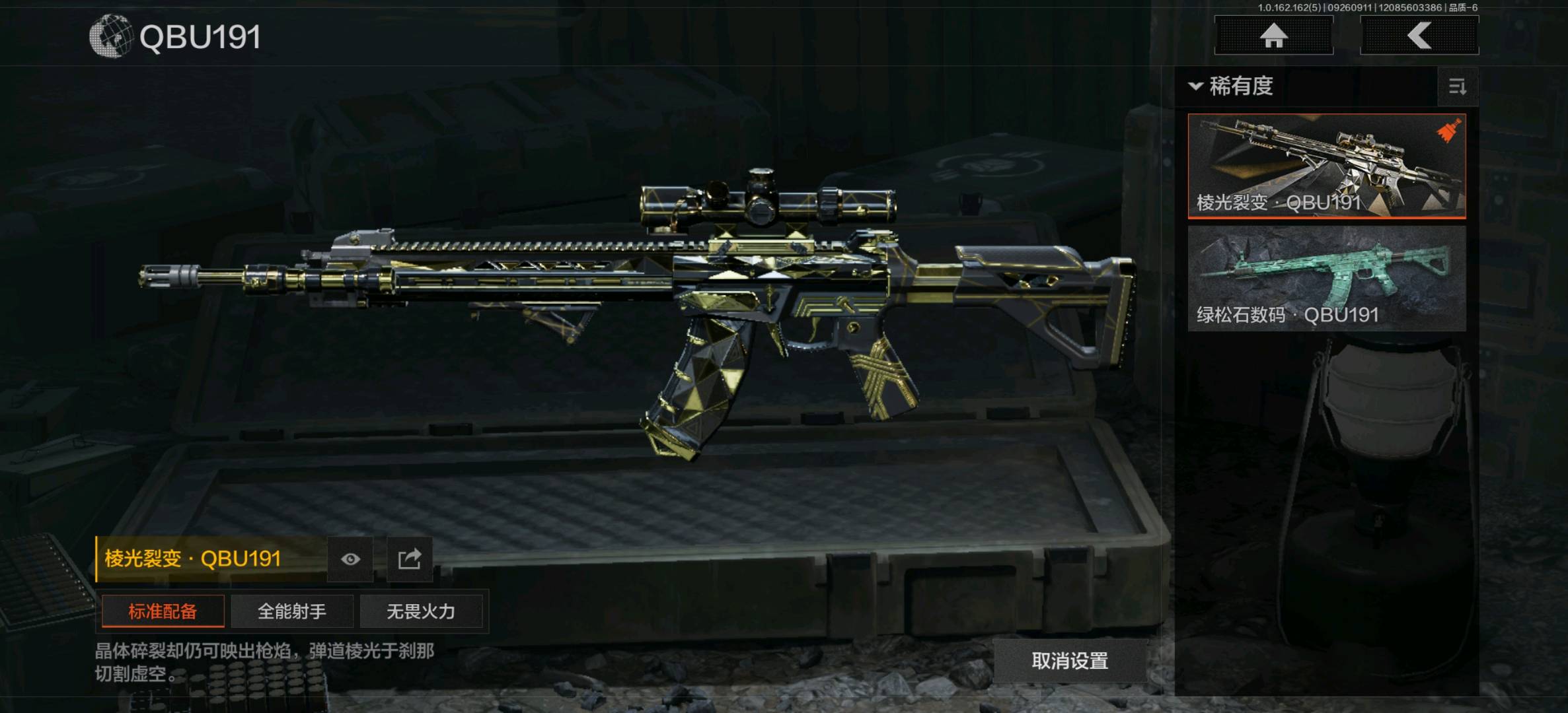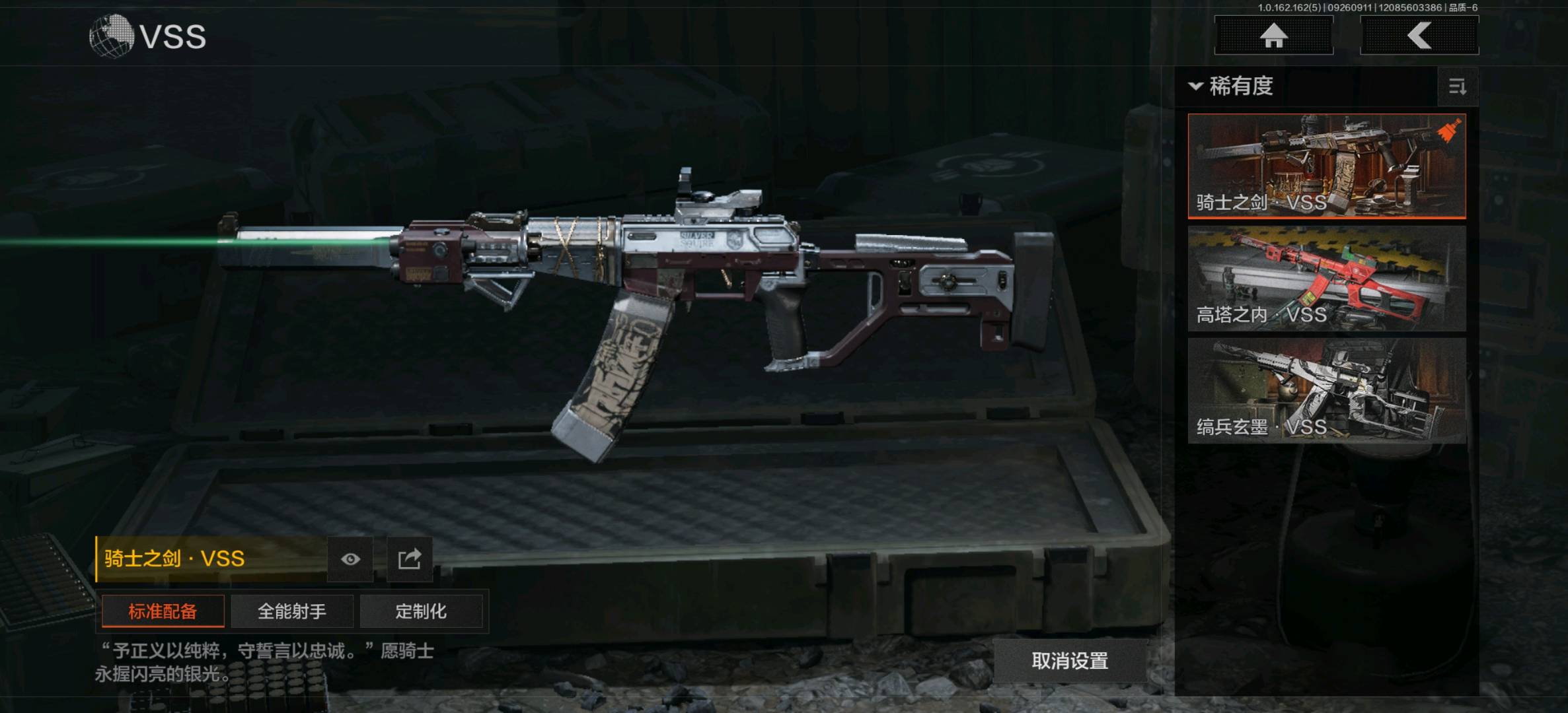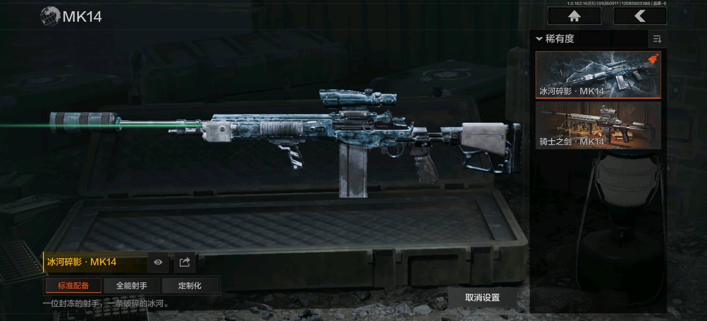 湖冰倒影MP5,掌中盾MP5,脊峰速降MPX,玄戈梨花MPX,高塔之内P90,神锋Vector45;骑士之剑VSS,冰河碎影MK14,棱光裂变QBU191,高塔之内VSS,缟兵玄墨VSS,骑士之剑MK14,快乐游戏M110;棱光裂变莫辛;娜迦RPK16