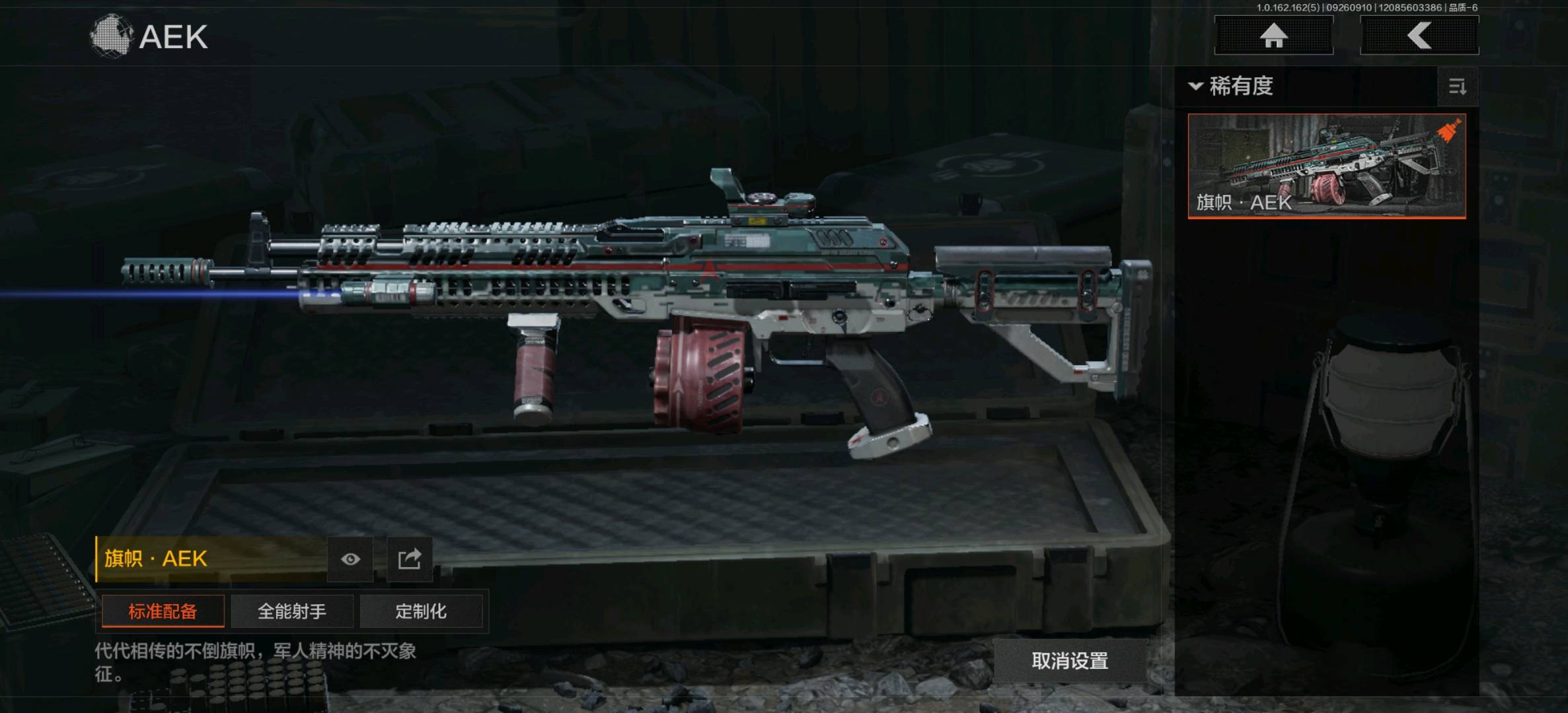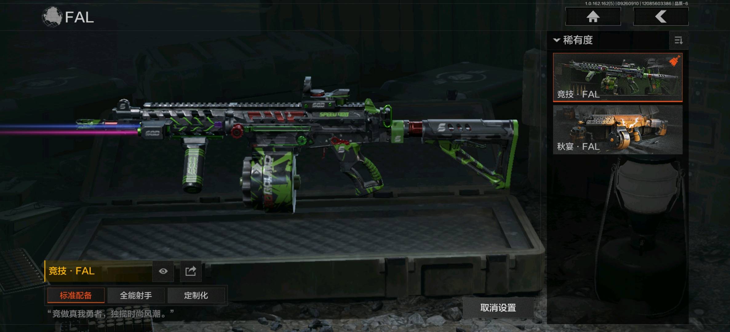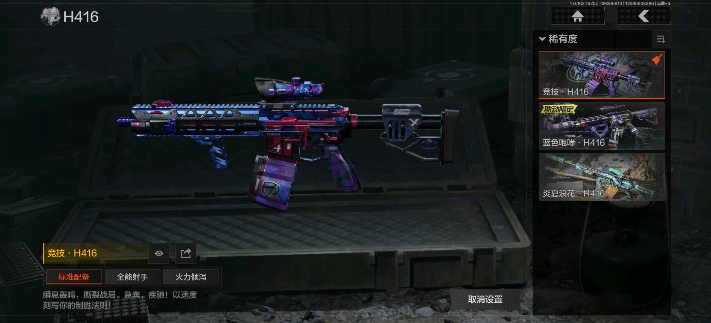 竞技FAL,蓝色咆哮H416,旗帜AEK,棱光裂变AKM,来战AKM,黑金国际M4A1,炎夏浪花H416,北国内卫MDR,棱光裂变AK102,火力倾泻AUG,竞技AUG,来战AK74N,骑士之剑AKS74U,赢家F2000,钢铁真理F2000,炎夏浪花AR57,战术大师AR57,棱光裂变ACE31,骑士之剑ACE31,湖冰倒影ACE31,北国内卫AN94,阴影AN94,百锻寒芒T951,彻甲铜斑T951,百锻寒芒T03,07式林地迷彩QBZ191