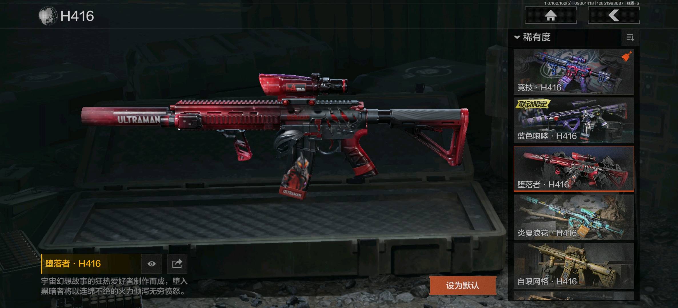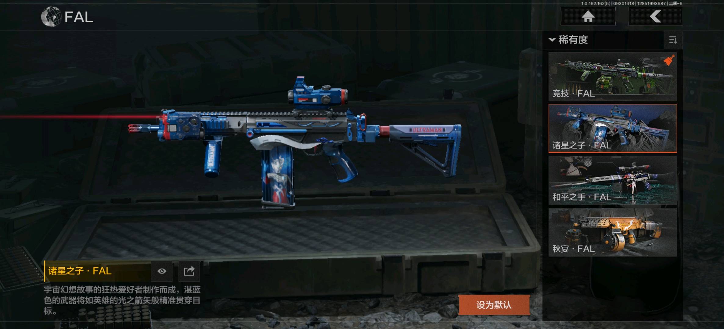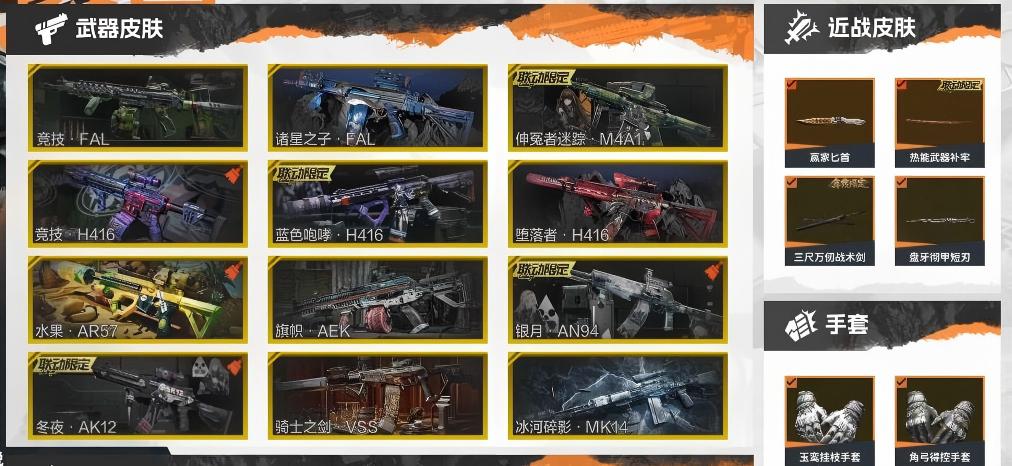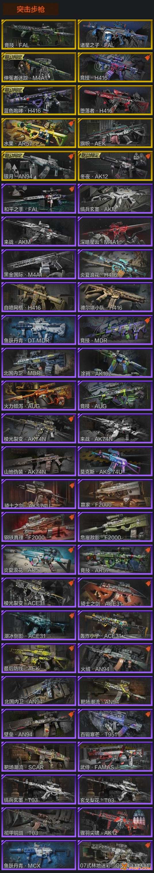 竞技FAL,诸星之子FAL,伸冤者迷踪M4A1,竞技H416,蓝色咆哮H416,堕落者H416,水果AR57,旗帜AEK,银月AN94,冬夜AK12,和平之手FAL,缟兵玄墨AKM,来战AKM,深暗星云M4A1,黑金国际M4A1,炎夏浪花H416,自喷网格H416,德尔塔小队H416,鱼跃丹青DTMDR,竞技MDR,北国内卫MDR,涂鸦AK102,火力倾泻AUG,竞技AUG,棱光裂变AK74N,来战AK74N,山地伪装AK74N,莫克斯AKS74U,骑士之剑AKS74U,赢家F2000,钢铁真理F2000,危崖敌影F2000,炎夏浪花AR57,竞技AR57,棱光裂变ACE31,骑士之剑ACE31,湖冰倒影ACE31,轰炸小子ACE31,最后防线AEK,火绒AN94,北国内卫AN94,靶场潮流AN94,壁垒AN94,百锻寒芒T951,靶场潮流SCAR,武侍FAMAS,缟兵玄墨T03,玄戈梨花T03,彻甲铜斑T03,骤羽尖啸AK12,鱼跃丹青MCX,07式林地迷彩QBZ191;