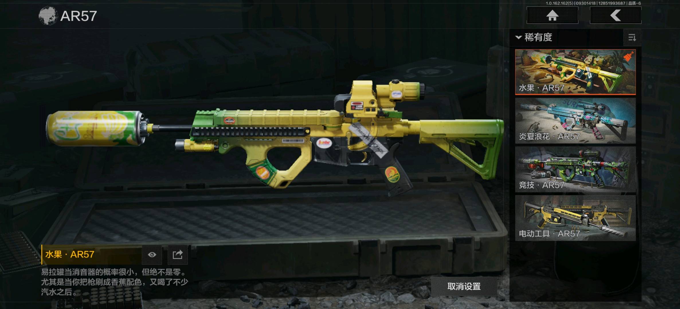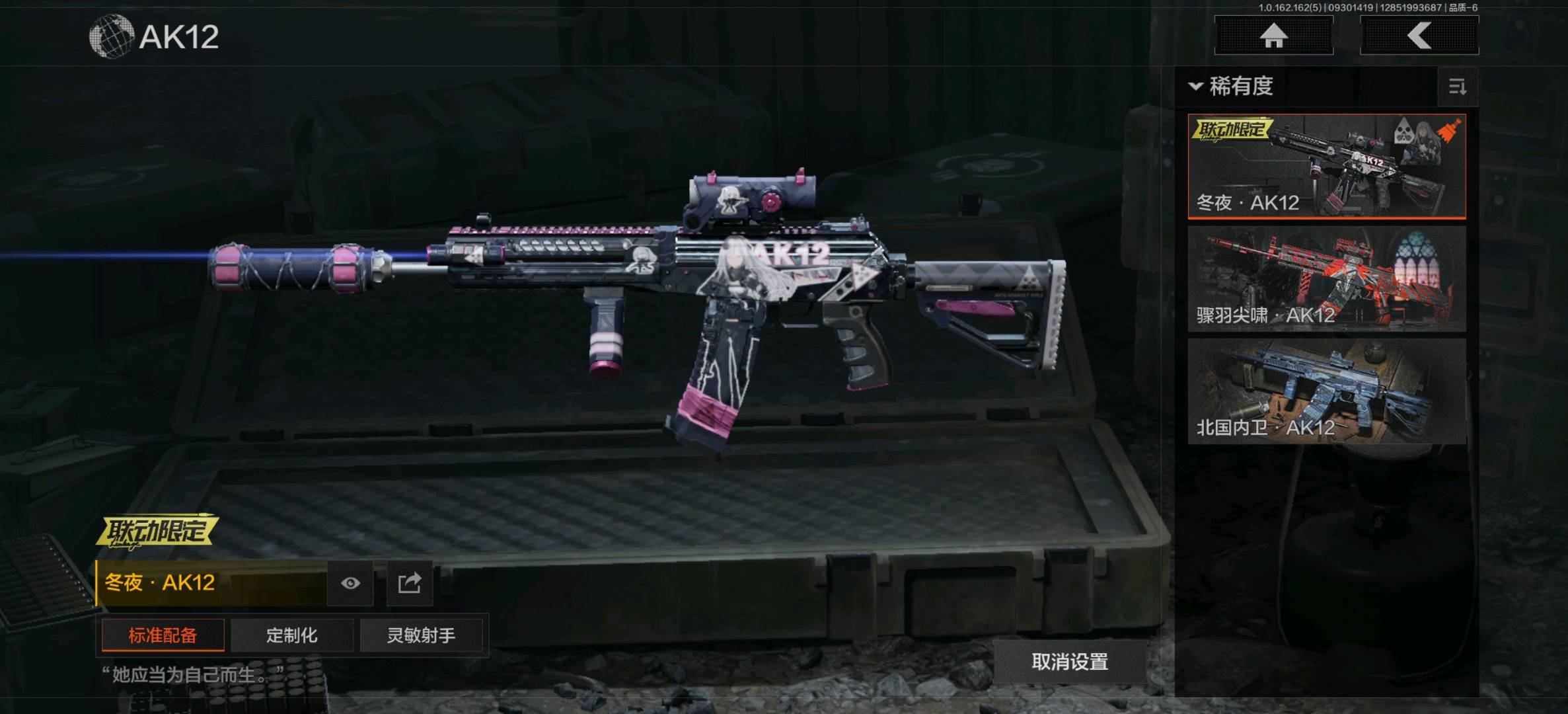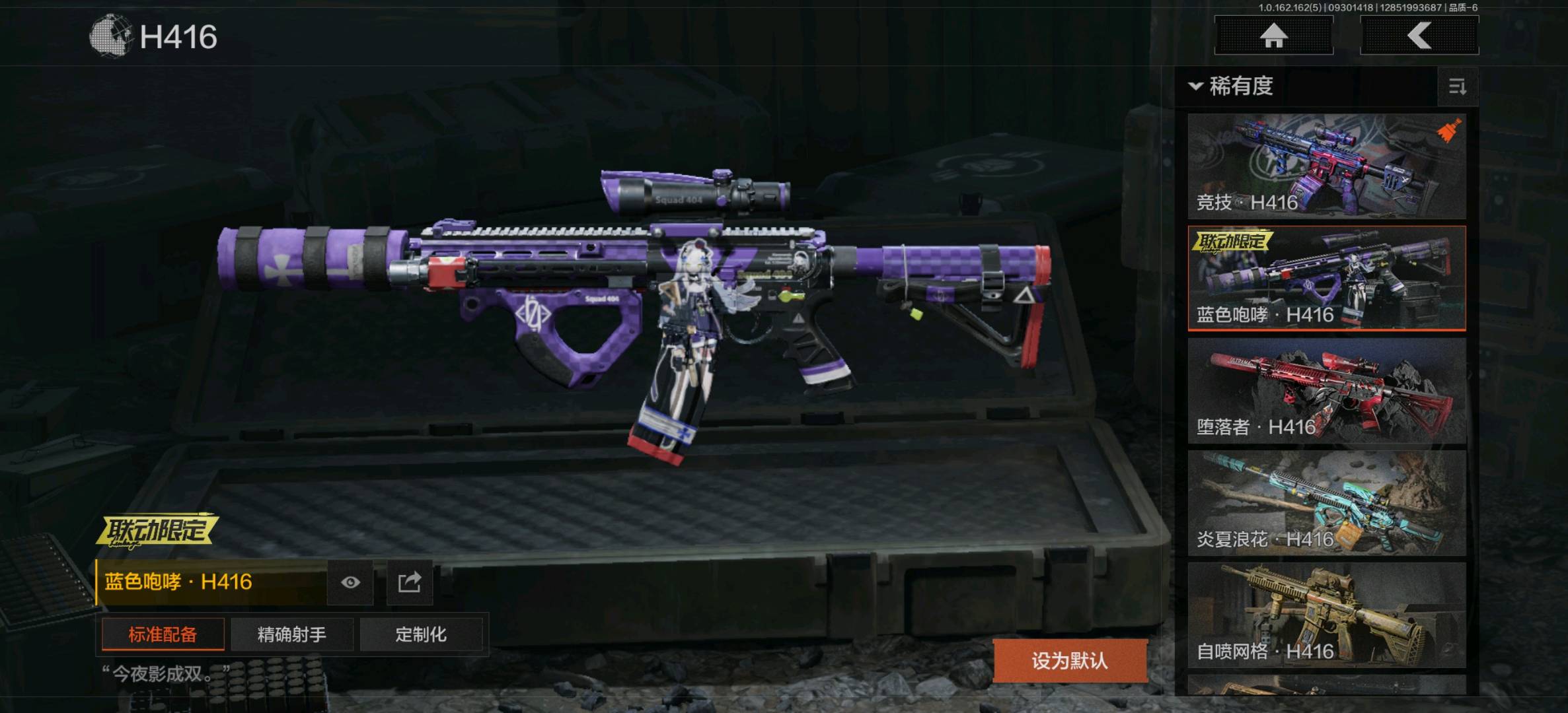 竞技FAL,诸星之子FAL,伸冤者迷踪M4A1,竞技H416,蓝色咆哮H416,堕落者H416,水果AR57,旗帜AEK,银月AN94,冬夜AK12,和平之手FAL,缟兵玄墨AKM,来战AKM,深暗星云M4A1,黑金国际M4A1,炎夏浪花H416,自喷网格H416,德尔塔小队H416,鱼跃丹青DTMDR,竞技MDR,北国内卫MDR,涂鸦AK102,火力倾泻AUG,竞技AUG,棱光裂变AK74N,来战AK74N,山地伪装AK74N,莫克斯AKS74U,骑士之剑AKS74U,赢家F2000,钢铁真理F2000,危崖敌影F2000,炎夏浪花AR57,竞技AR57,棱光裂变ACE31,骑士之剑ACE31,湖冰倒影ACE31,轰炸小子ACE31,最后防线AEK,火绒AN94,北国内卫AN94,靶场潮流AN94,壁垒AN94,百锻寒芒T951,靶场潮流SCAR,武侍FAMAS,缟兵玄墨T03,玄戈梨花T03,彻甲铜斑T03,骤羽尖啸AK12,鱼跃丹青MCX,07式林地迷彩QBZ191;