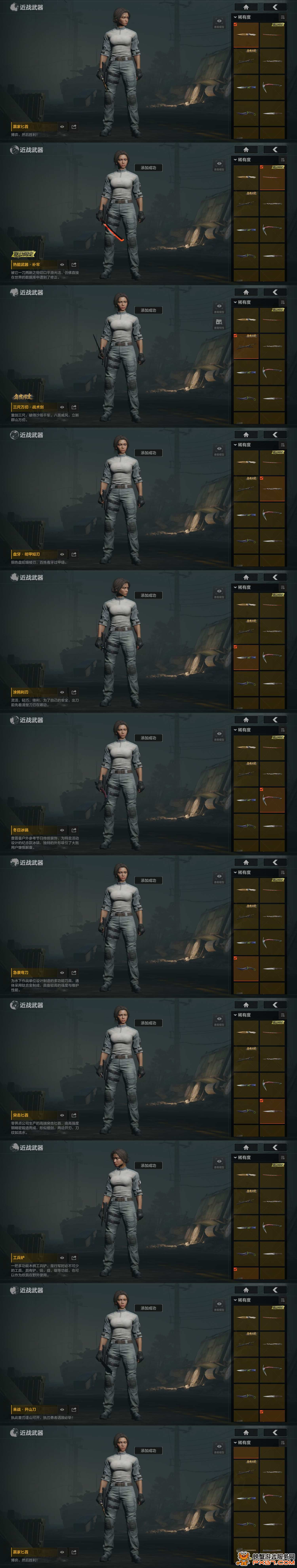 赢家匕首,热能武器补牢,三尺万仞战术剑,盘牙彻甲短刃,涂鸦利刃,冬日冰镐,急袭弯刀,突击匕首,工兵铲,来战开山刀;