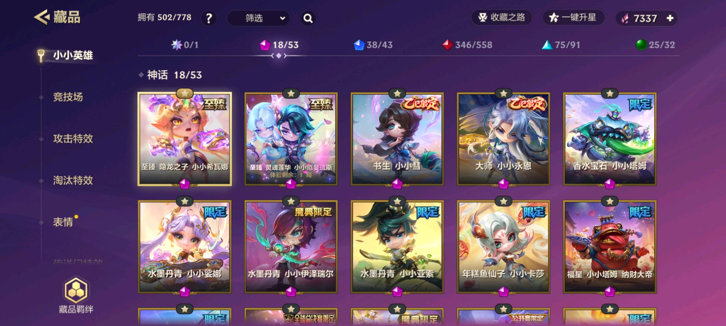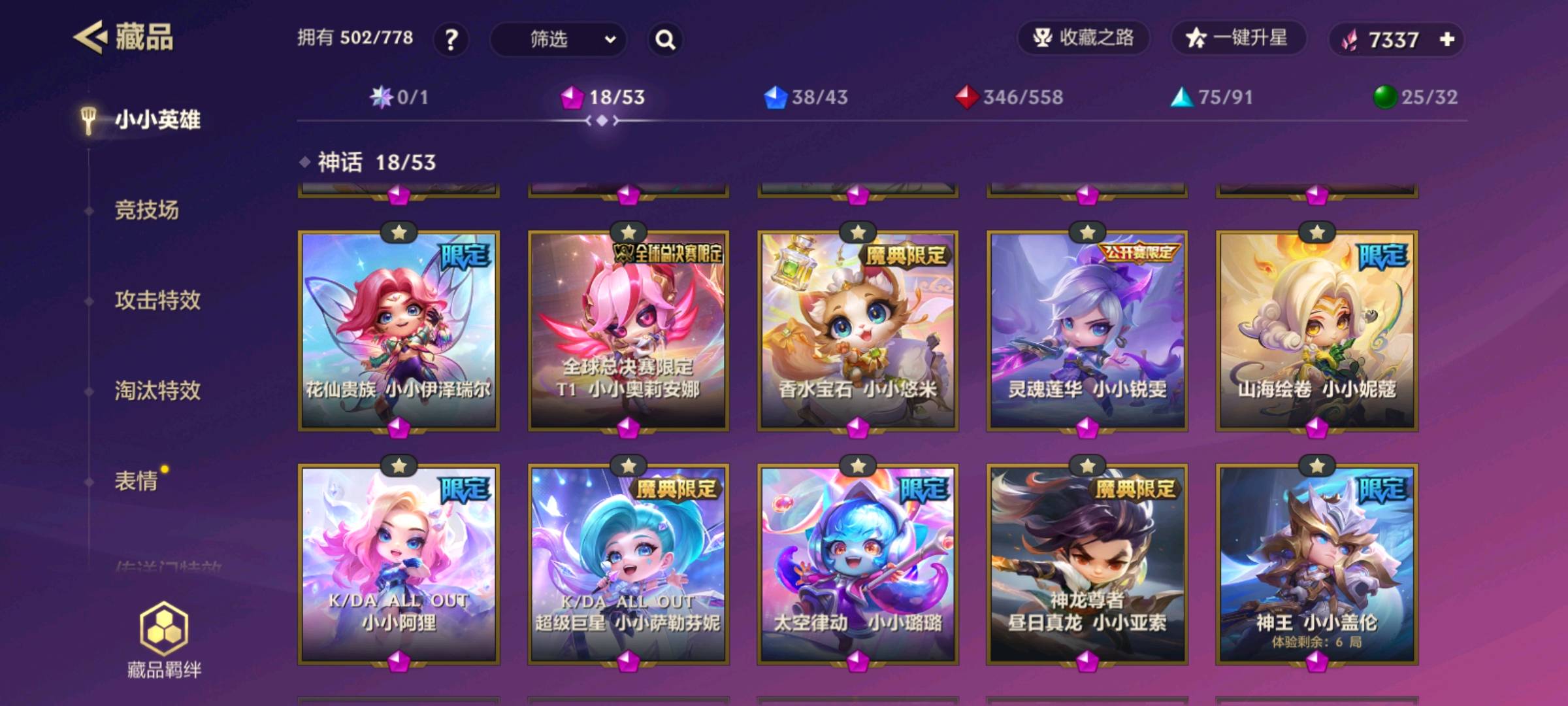 502小小英雄/65竞技场/23神话攻击特效/多个赛季魔典皮肤/至臻龙女/福星塔姆/宝石塔姆/大师永恩/T1奥利安娜/金龙亚索/水墨亚索/水墨伊泽/花仙伊泽/书生慧/水墨娑娜/KDA阿狸/竞技场镜花水月 灵魂莲华 狗狗乐园 包饺子