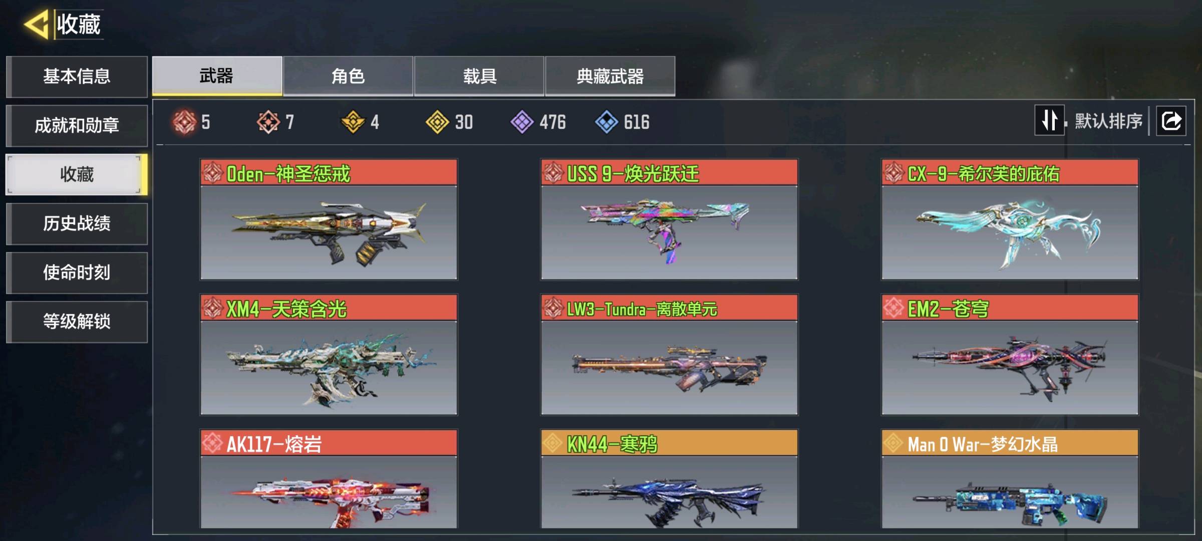 满级神话枪皮:Oden-神圣惩戒/USS 9-焕光跃迁/CX-9希尔芙的庇佑/XM4-天策含光/LW3-离散单元