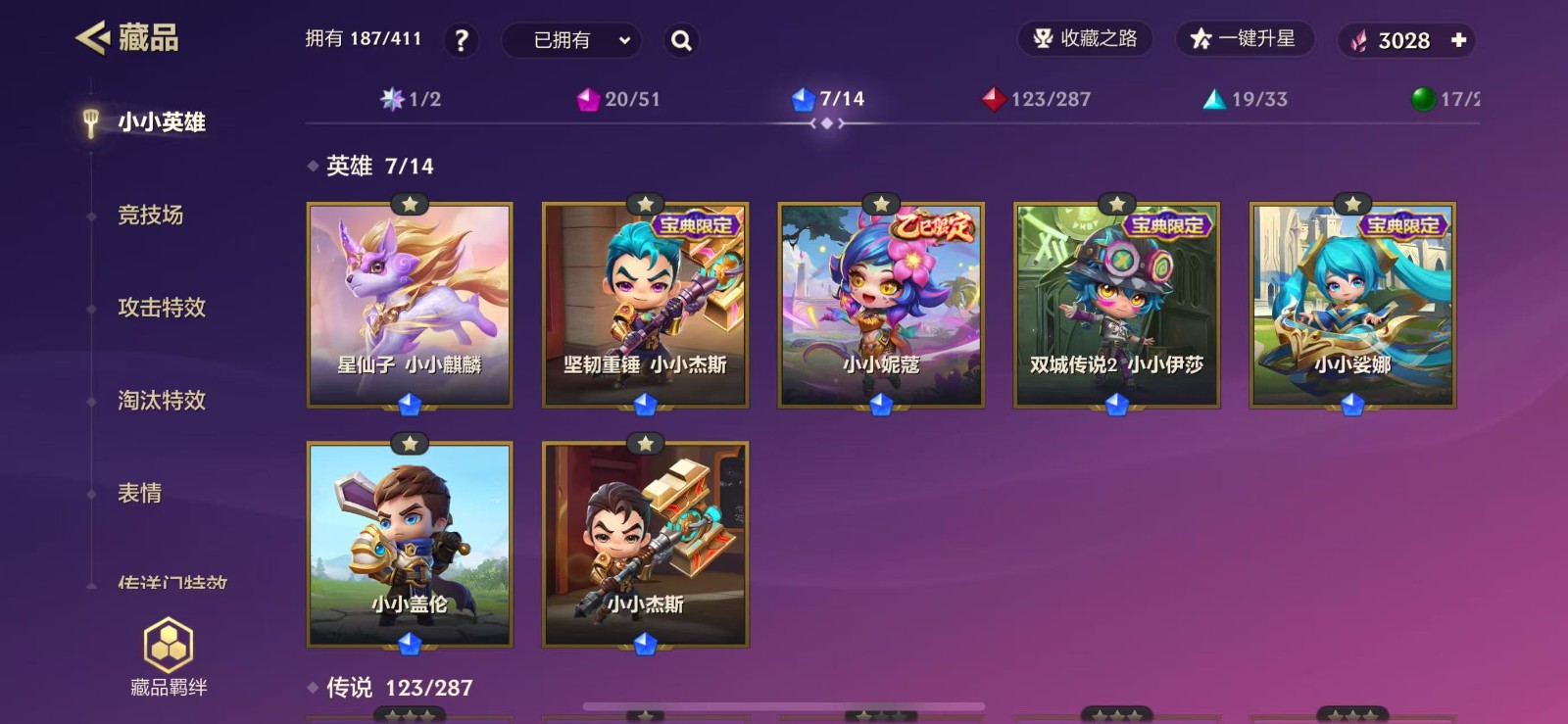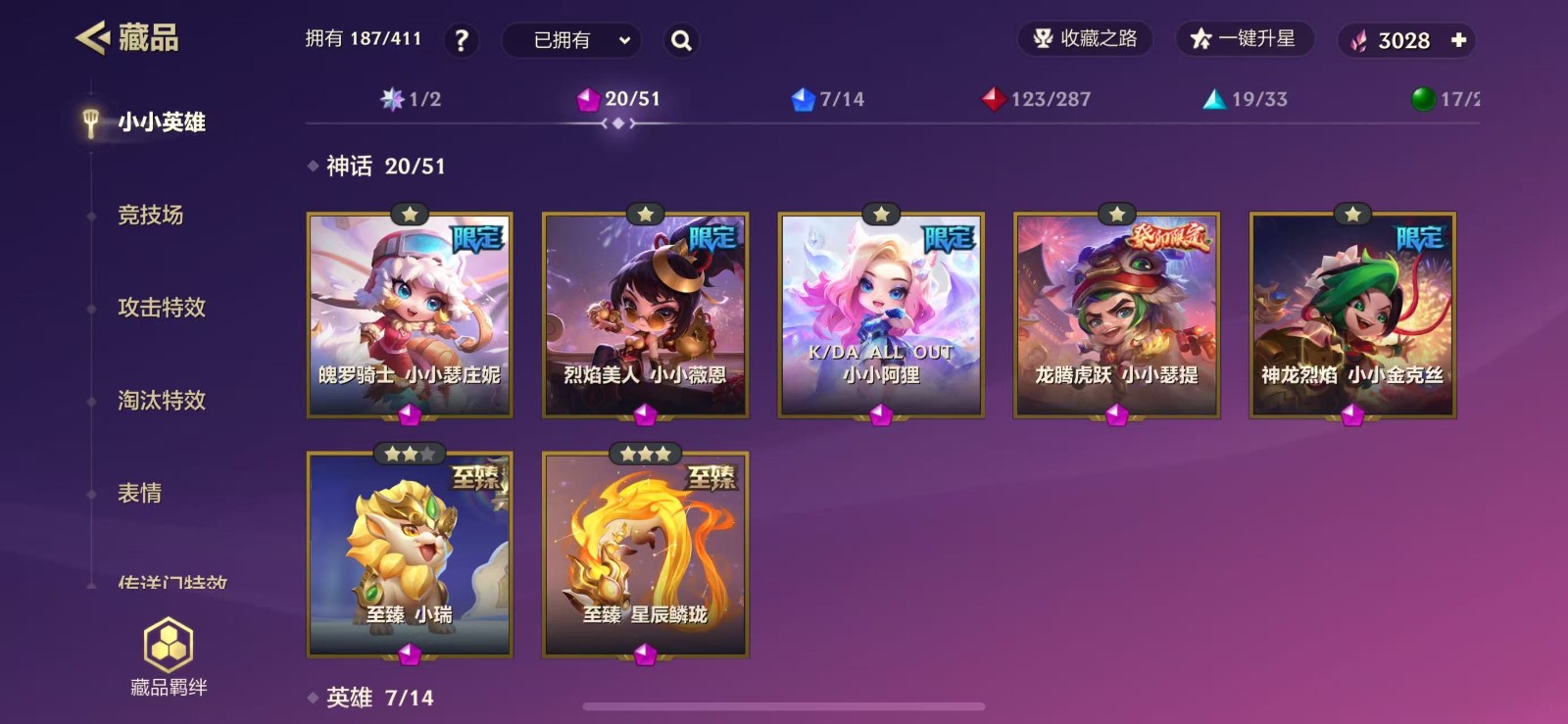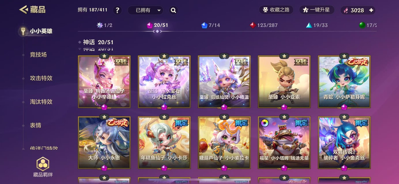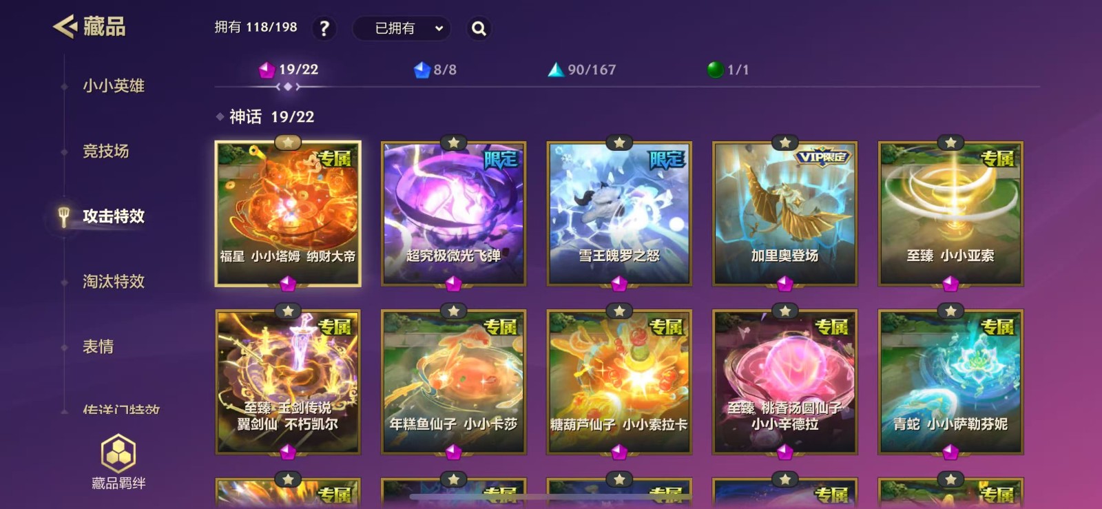 【苹果】 187小小英雄/1卓越/20神话/4至臻/11限定/可排/118攻击特效/V10福星塔姆满炫彩无前途